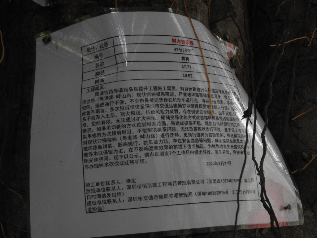 9月6日,有網(wǎng)民在深圳論壇發(fā)帖《深圳版的指鹿為馬,蓮塘為了砍樹,不是榕樹硬說是榕樹》反映,稱“百世路邊大樹貼上一張張紙條,大意是這些榕樹根系發(fā)達(dá),破壞人行道、路牙和機(jī)動(dòng)車路面,為了精準(zhǔn)提升,所以要移除砍掉!仔細(xì)看看,這些行道樹根本就不是榕樹,而且沒有損壞道路路面,至于路邊的人行道,是這兩年才修建有的,之前屬于路邊綠化帶,種花草?!笔嗄陙頉]有一棵樹被臺(tái)風(fēng)吹倒!該網(wǎng)友稱影響該路段市民出行另有原因,“至于市民被迫在機(jī)動(dòng)車道上行走,那是道路的兩邊停滿了機(jī)動(dòng)車,很多都是僵尸車,沒人管。”