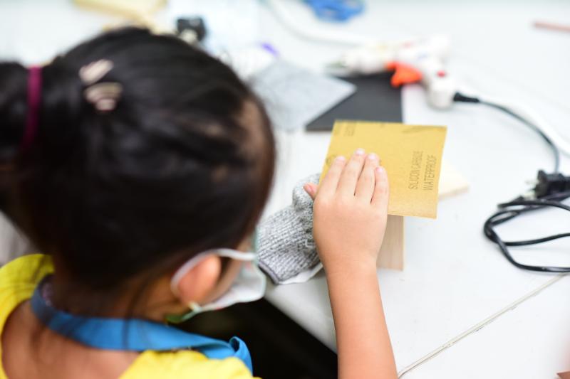 對(duì)于“小小木匠”來(lái)說(shuō),安安靜靜的坐下來(lái),發(fā)揮想象力,傾心打造屬于自己的木質(zhì)音樂(lè)盒,無(wú)疑是最開(kāi)心的時(shí)刻。聽(tīng)完老師的講解后,小朋友們迅速進(jìn)入角色,他們拿著原料木材,一個(gè)個(gè)化身“小魯班”,用尺子“計(jì)較長(zhǎng)短”,為它們“改頭換面”起來(lái)。活動(dòng)現(xiàn)場(chǎng),一位小朋友正拿著砂紙,小心翼翼的打磨木料,再問(wèn)及他打磨的工序時(shí),小朋友頗具匠心的告誡記者:“先要用這種粗一點(diǎn)的砂紙打磨,再用這個(gè)細(xì)的,這樣打磨出來(lái)的音樂(lè)盒表面就特別光滑啦……”