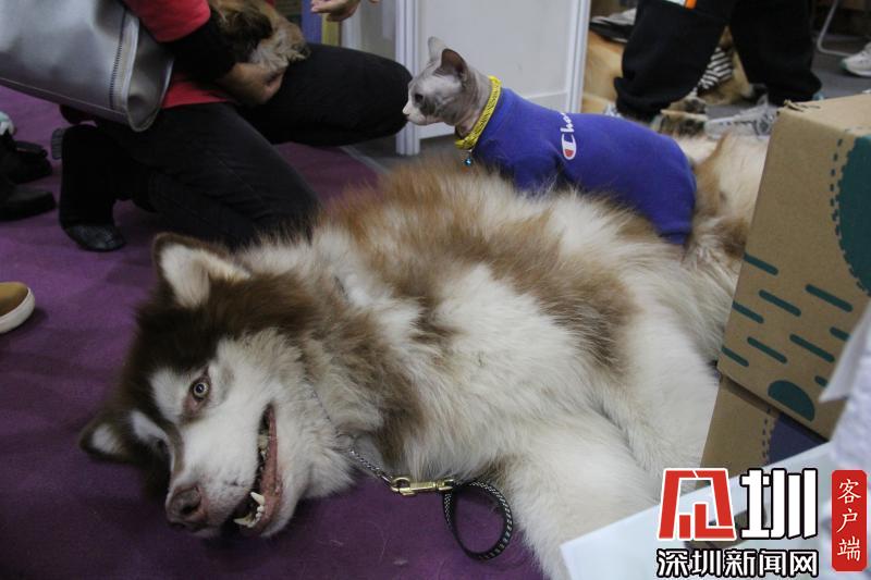 展商的無毛貓正坐在一只阿拉斯加犬身上四處張望。