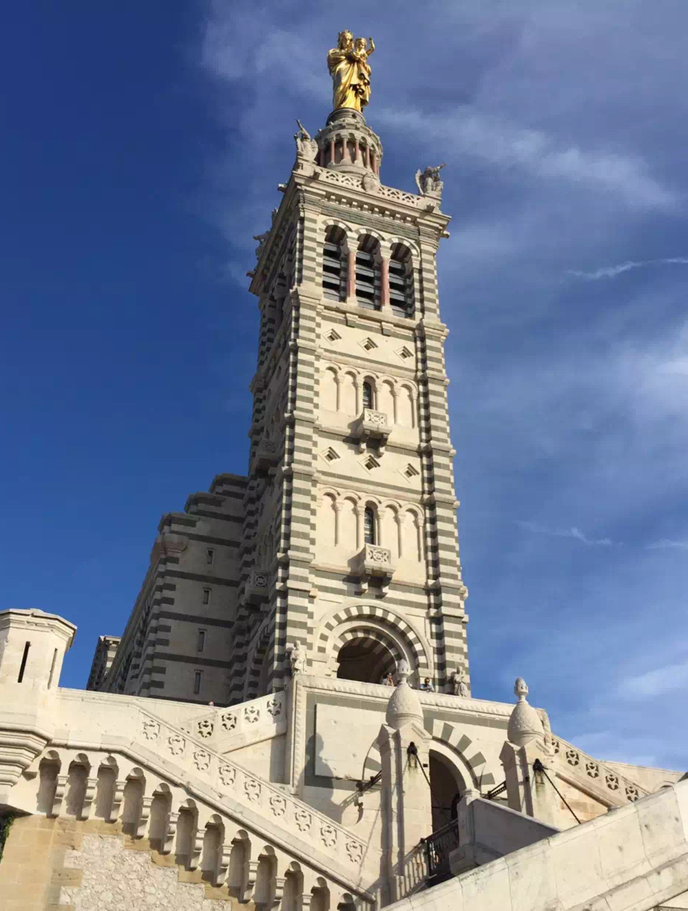 教堂主體建筑上方有一座金色的高達(dá)9.7米的鍍金圣母像,據(jù)說(shuō),幾乎在馬賽的任何角度都可看到這尊閃閃發(fā)光的圣母像,教堂也因此成為馬賽的標(biāo)志。李仁奇 攝