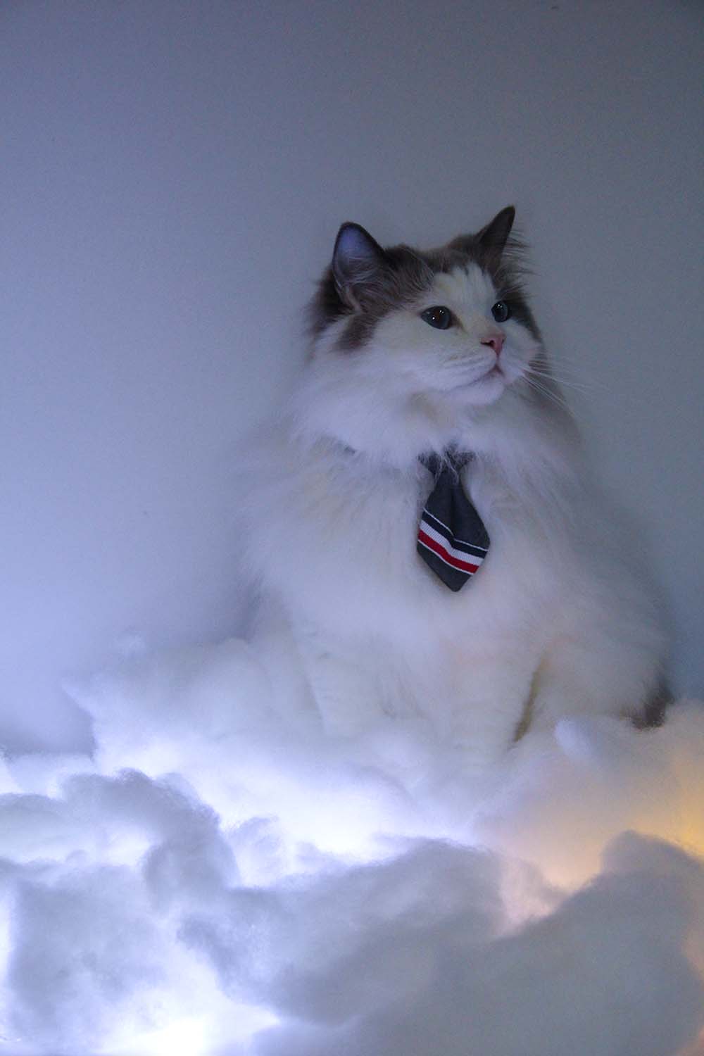 此次展出的拍攝主題有兩個(gè)系列。第一個(gè)系列主題為“云吸貓”,詞語(yǔ)本意是在網(wǎng)絡(luò)上吸貓,品牌團(tuán)隊(duì)以此作為靈感,設(shè)計(jì)云端的場(chǎng)景,打造出一組貓咪在云端的可愛作品。第二個(gè)系列則按照模特的風(fēng)格量身定制,充分展示了模特的個(gè)人風(fēng)采。