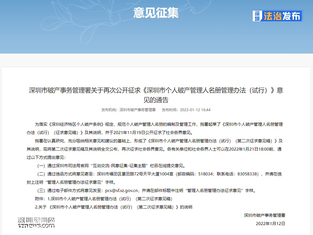 讀特客戶端?深圳新聞網(wǎng)2022年1月18日訊(記者 張玲)日前,深圳市破產(chǎn)事務(wù)管理署在深圳市司法局發(fā)布通告,面向社會(huì)征集《深圳市個(gè)人破產(chǎn)管理人名冊(cè)管理辦法(試行)》(以下簡(jiǎn)稱管理辦法)的意見,有意提交者可在2022年1月21日18時(shí)前提交。
