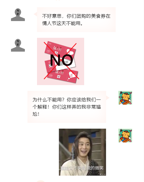 遇到春節(jié)、情人節(jié)等特殊時期,消費者在團購時應當看清使用期限,如商家未提前說明美食券的限用日期,而是去到現場才告知消費者不能使用,則商家涉嫌侵害消費者的知情權、公平交易權。如商家銷售美食券的頁面,注明情人節(jié)不能使用,此時商家盡到了提醒義務,消費者可在規(guī)定的其他時間內使用美食券,或者向平臺申請退款。(消費提示:消費者購買團購券時,要仔細閱讀團購頁面的使用說明,特別是要仔細瀏覽團購券使用時限。限用人數等具體內容,避免遭遇買了卻用不了的困境。)