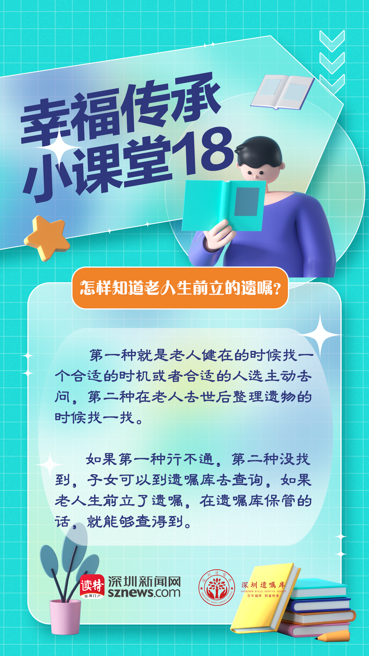 還有一種方法是在老人去世后整理遺物的時候可能發(fā)現(xiàn)書面遺囑。當(dāng)然還有第三種辦法。由深圳新聞網(wǎng)聯(lián)合廣東嘉得信律師事務(wù)所、深圳遺囑庫特別策劃的“幸福傳承小課堂”第18期,我們來聊聊第三種辦法查詢老人生前立的遺囑。如果第一種辦法行不通,第二種辦法又找不到的話,我們的建議是,可以去遺囑庫查詢。在老人去世后,如果老人生前立了遺囑,在遺囑庫保存的話,就可以找得到。