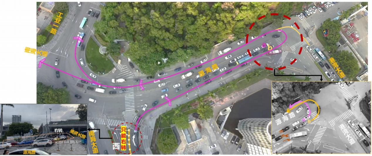 南山區(qū)南海大道時間廣場路段是通往蛇口、前海的重要道路,早晚高峰期車流量較大。修地鐵時在南海大道做了“布袋口臨時設施”,南海大道現(xiàn)已經恢復通車,但因臨時設施還未及時拆掉,路口紅綠燈沒有啟用。加之車道收窄,原本可以快速左轉北行的車流被擠成一條右轉車道,再擠到老碼頭掉頭,四車道變一車道,導致高峰期多數(shù)車輛爭搶道,既不安全還加劇了擁堵。