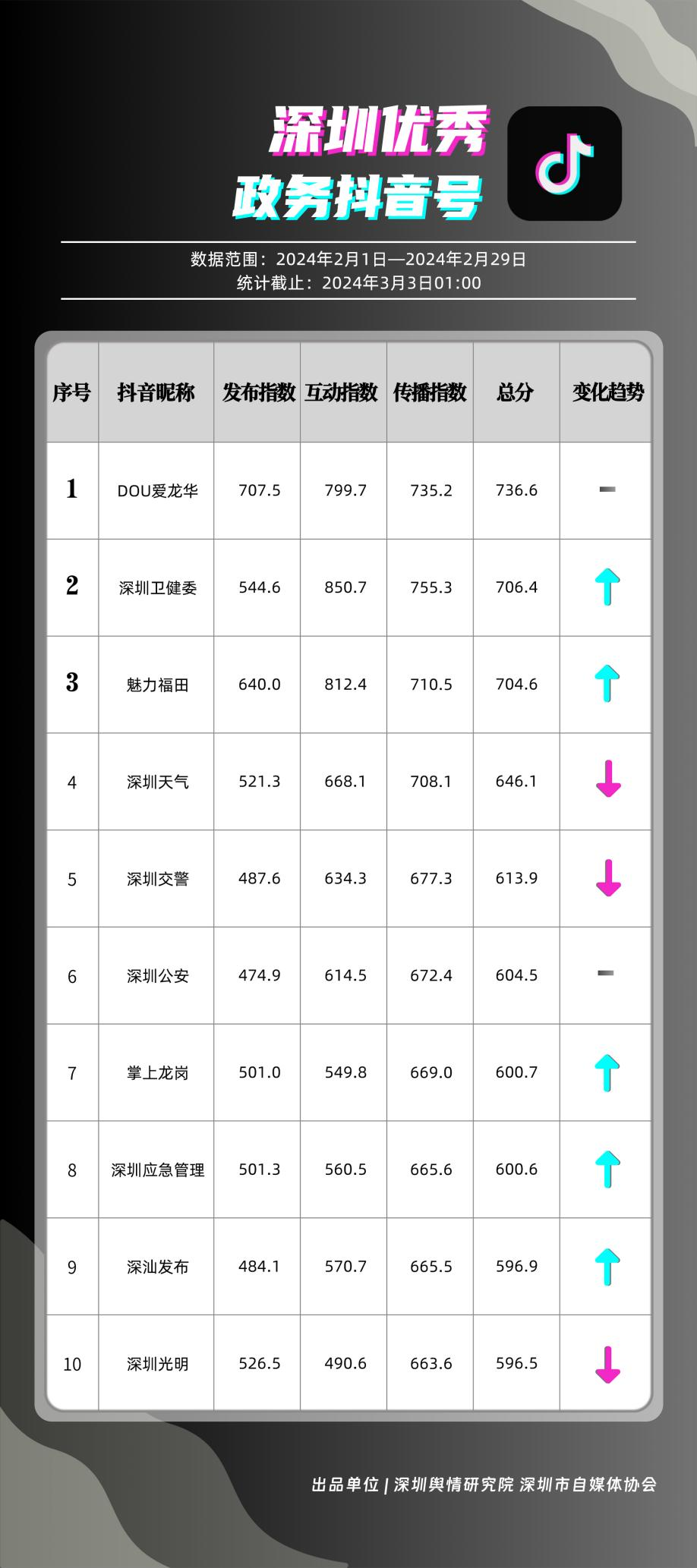 深圳新聞網(wǎng)3月21日訊(記者 陳曉君 實(shí)習(xí)生 蔡曉婷)3月19日,深圳輿情研究院、深圳市自媒體協(xié)會(huì)聯(lián)合發(fā)布《深圳優(yōu)秀政務(wù)新媒體矩陣》(2月期),市衛(wèi)生健康委、福田區(qū)、市氣象局、龍華區(qū)、龍崗區(qū)、光明區(qū)、市應(yīng)急管理局、市公安局、市交通警察局和深汕特別合作區(qū)新媒體矩陣榮獲“深圳優(yōu)秀政務(wù)新媒體矩陣”稱號(hào)。這些新媒體矩陣主要結(jié)合市民實(shí)際需求進(jìn)行內(nèi)容創(chuàng)作與更新,推動(dòng)信息傳播質(zhì)效提升。