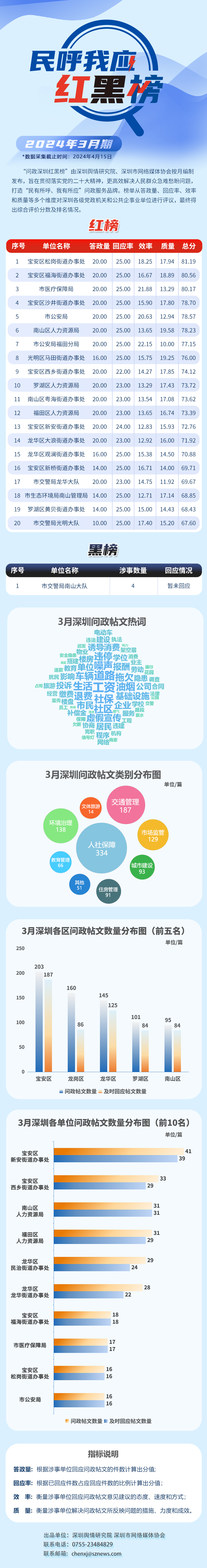 2024年3月,共有20家單位因積極開展網(wǎng)絡答政工作,贏得群眾的支持與認可,最終登上“紅榜”,它們分別是:寶安區(qū)松崗街道辦事處、寶安區(qū)福海街道辦事處、市醫(yī)療保障局、寶安區(qū)沙井街道辦事處、市公安局、南山區(qū)人力資源局、市公安局福田分局、光明區(qū)馬田街道辦事處、寶安區(qū)西鄉(xiāng)街道辦事處、羅湖區(qū)人力資源局、南山區(qū)粵海街道辦事處、福田區(qū)人力資源局、寶安區(qū)新安街道辦事處、龍華區(qū)大浪街道辦事處、龍華區(qū)觀瀾街道辦事處、寶安區(qū)新橋街道辦事處、市交警局龍華大隊、市生態(tài)環(huán)境局南山管理局、羅湖區(qū)黃貝街道辦事處、市交警局光明大隊。另外,市交警局南山大隊因相關(guān)帖文回應率偏低,整體答政效果不佳,被列入了“黑榜”。