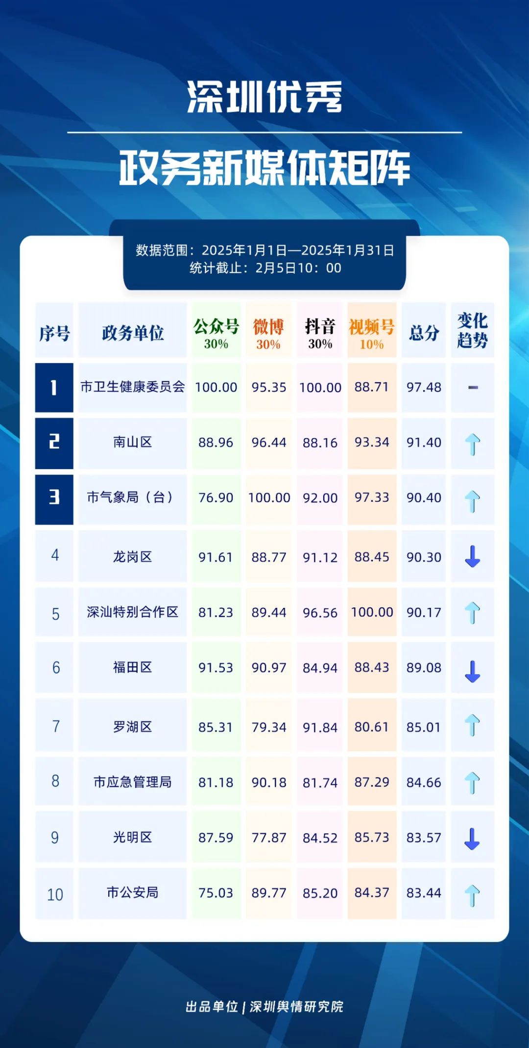 2025年1月期《深圳優(yōu)秀政務(wù)新媒體矩陣》發(fā)布,一同揭曉哪些政務(wù)新媒體矩陣能夠憑借其卓越表現(xiàn)脫穎而出,成為推動(dòng)政務(wù)信息傳播與服務(wù)模式創(chuàng)新的領(lǐng)航者,引領(lǐng)政務(wù)新媒體運(yùn)營(yíng)邁向新高度。