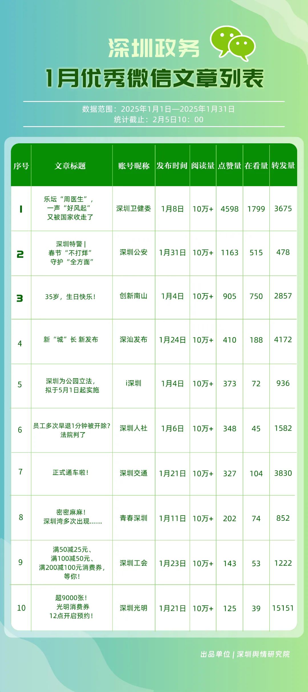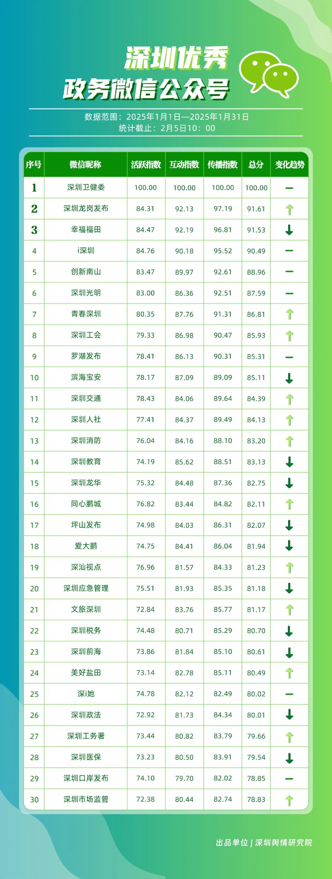 1月,“深圳衛(wèi)健委”“深圳龍崗發(fā)布”“幸福福田”“i深圳”“創(chuàng)新南山”“深圳光明”“青春深圳”“深圳工會(huì)”“羅湖發(fā)布”“濱海寶安”等30個(gè)賬號(hào)入選“深圳優(yōu)秀政務(wù)微信公眾號(hào)”。其中,“深圳衛(wèi)健委”各方面表現(xiàn)卓越,位于榜單首位,獲得總分100分?!吧钲邶垗彴l(fā)布”“青春深圳”“深圳工會(huì)”排名在本期有所提升,反映了這些賬號(hào)在內(nèi)容創(chuàng)新與受眾互動(dòng)方面的不懈努力。“i深圳”“創(chuàng)新南山”“深圳光明”“羅湖發(fā)布”則保持了穩(wěn)健的排名,持續(xù)在政務(wù)信息的傳播中扮演著不可或缺的角色。