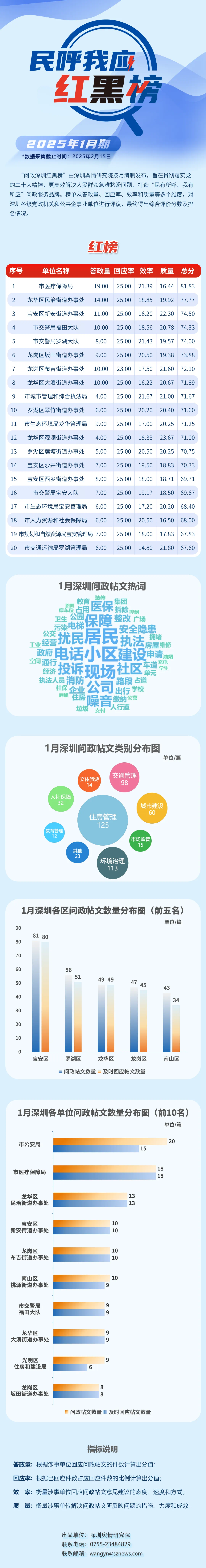 本期榜單采集的帖文主要來自深圳市及各區(qū)政府官網(wǎng)、深圳論壇、人民網(wǎng)領(lǐng)導(dǎo)留言板、深圳新聞網(wǎng)“民呼我應(yīng)”等平臺,所采集帖文發(fā)布時間為2025年1月1日至1月31日,采集截止時間為2025年2月15日。