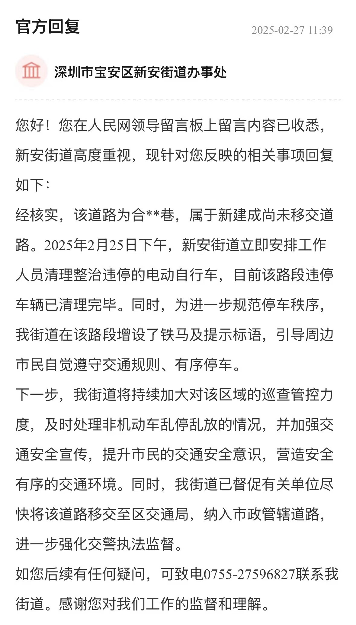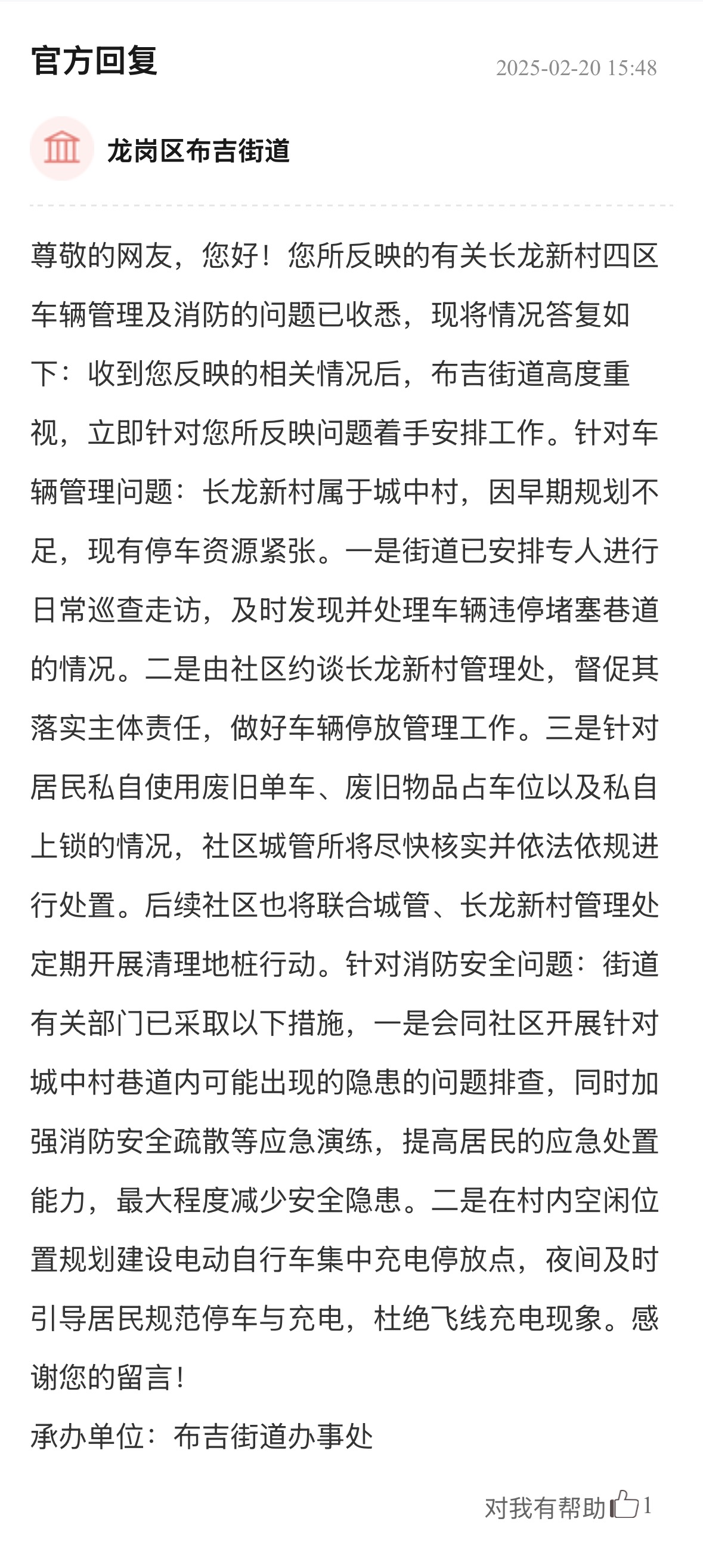 案例點(diǎn)評(píng):街道辦針對(duì)車(chē)輛管理、消防問(wèn)題多管齊下,旨在營(yíng)造一個(gè)通暢、安全的出行和生活環(huán)境,態(tài)度值得肯定?;貞?yīng)展示了街道辦構(gòu)建的“專(zhuān)項(xiàng)巡查+設(shè)施建設(shè)+行為引導(dǎo)”綜合治理體系,精準(zhǔn)直擊問(wèn)題核心,兼顧當(dāng)下整治與長(zhǎng)遠(yuǎn)規(guī)劃,切實(shí)保障居民居住和生活安全,其系統(tǒng)性解決思路對(duì)同類(lèi)區(qū)域治理具有重要參考價(jià)值。