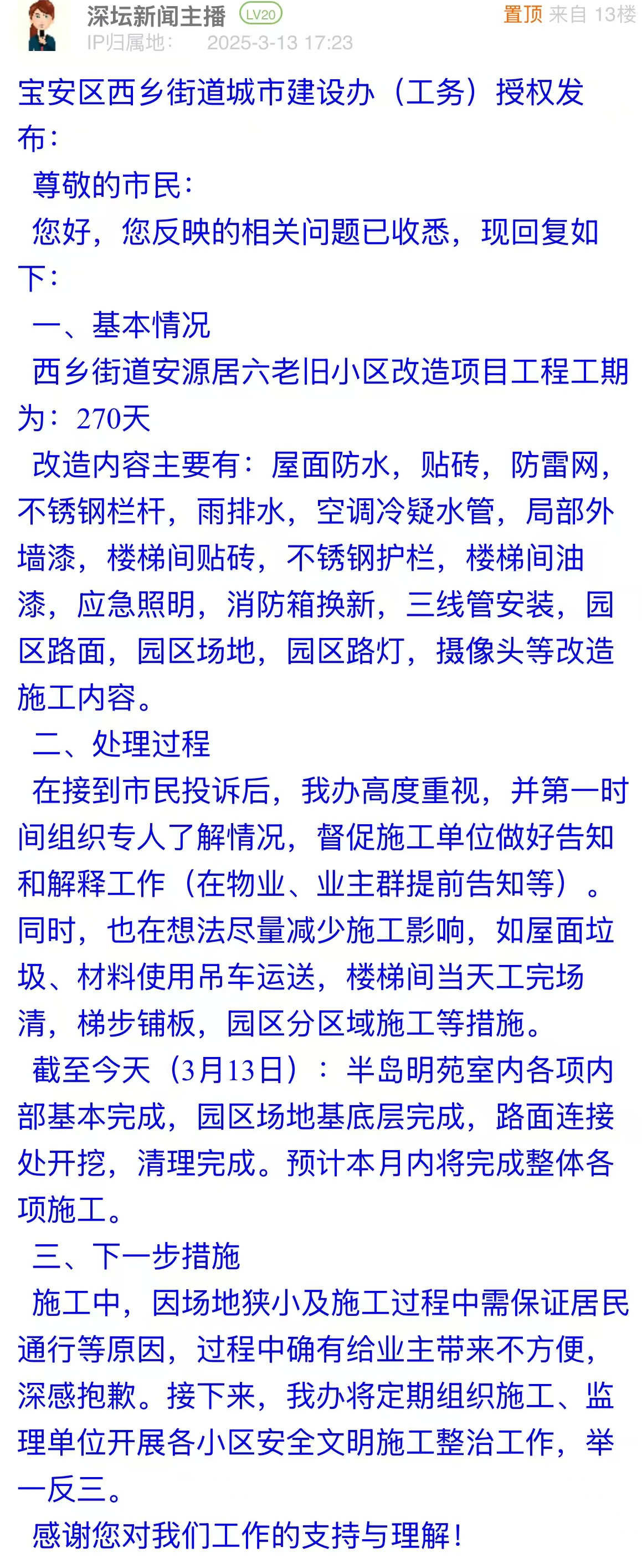 有市民反映寶安區(qū)一小區(qū)舊改過(guò)程中,施工單位無(wú)人監(jiān)管、施工無(wú)計(jì)劃、物業(yè)單位不作為、未做到文明施工