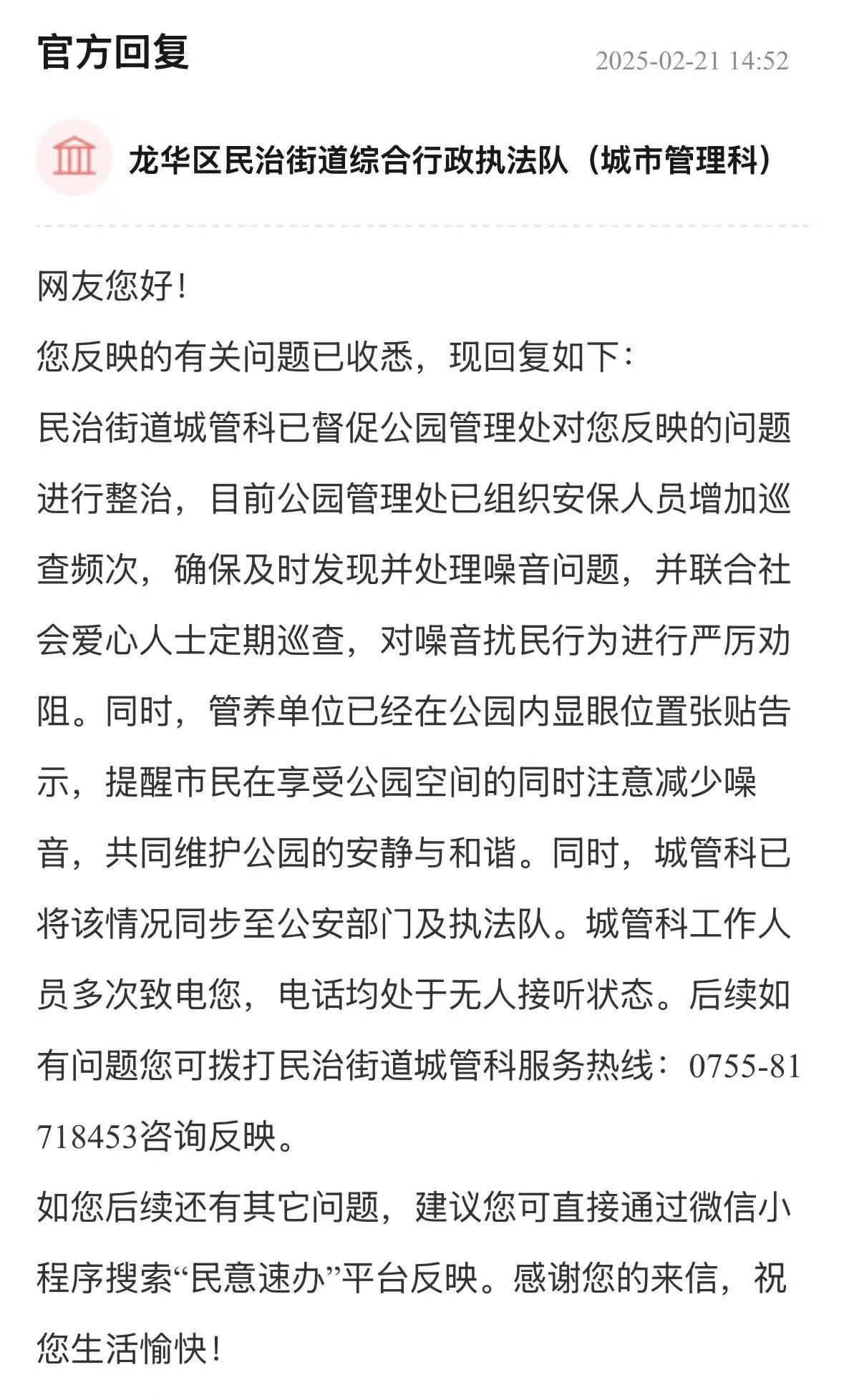 案例點(diǎn)評(píng):市民關(guān)注布心中學(xué)籃球場(chǎng)開(kāi)放時(shí)間,反映出對(duì)公共運(yùn)動(dòng)空間的迫切需求。羅湖區(qū)教育局詳細(xì)說(shuō)明場(chǎng)地未開(kāi)放原因及施工節(jié)點(diǎn),并明確后續(xù)開(kāi)放計(jì)劃,有效化解群眾疑慮,有助于“全民健身”政策更好落地。