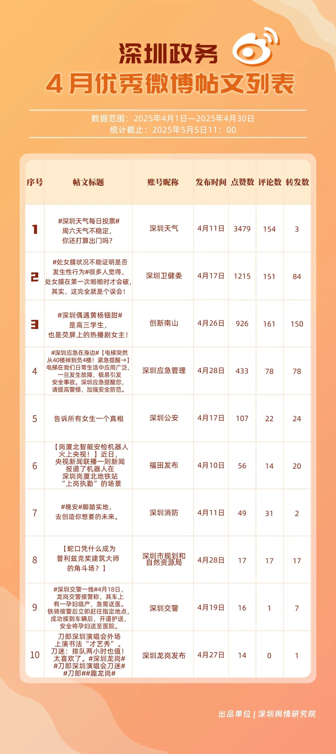 4月,“深圳天氣”“深圳衛(wèi)健委”“深圳消防”“深圳應(yīng)急管理”“創(chuàng)新南山”“深圳公安”“福田發(fā)布”“深圳龍崗發(fā)布”“深汕發(fā)布”“深圳交警”等20個賬號入選“優(yōu)秀政務(wù)微博號”。值得一提的是,“深圳天氣”在多個指標(biāo)中獲得滿分,其氣象信息的趣味性和實(shí)用性受到市民認(rèn)可;“深圳衛(wèi)健委”“深圳消防”“深圳應(yīng)急管理”也在信息傳播、互動服務(wù)等方面持續(xù)發(fā)力,以超過90分的總分緊跟其后;“深汕發(fā)布”“深圳交警”相較于3月在榜單排名有所提升,展現(xiàn)出強(qiáng)勁的發(fā)展勢頭。這些優(yōu)秀政務(wù)微博號的脫穎而出,不僅體現(xiàn)了各自的運(yùn)營實(shí)力,更反映出深圳政務(wù)新媒體在微博平臺的蓬勃發(fā)展態(tài)勢。