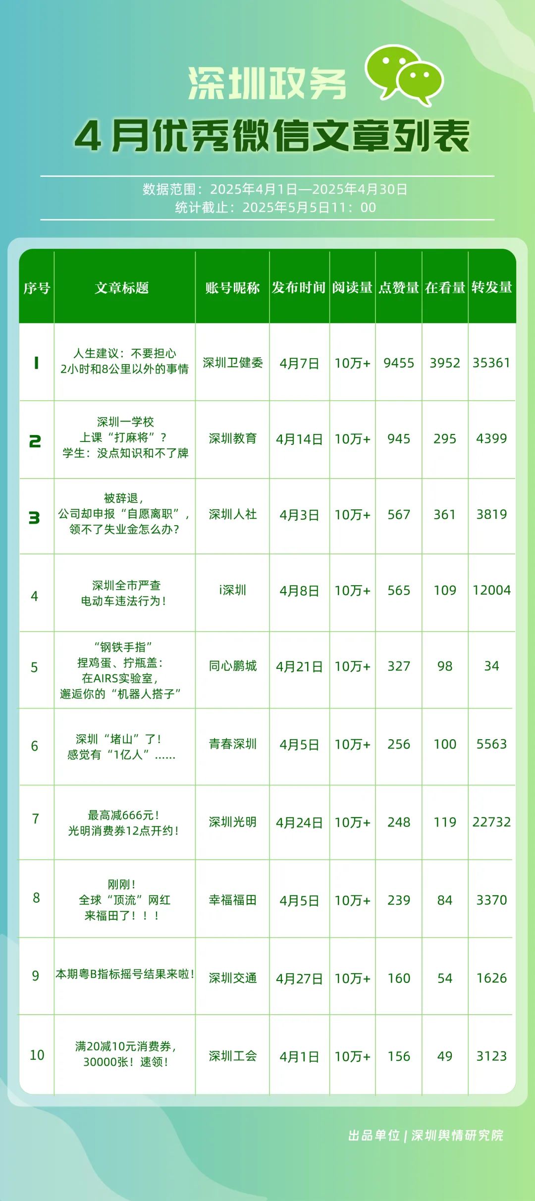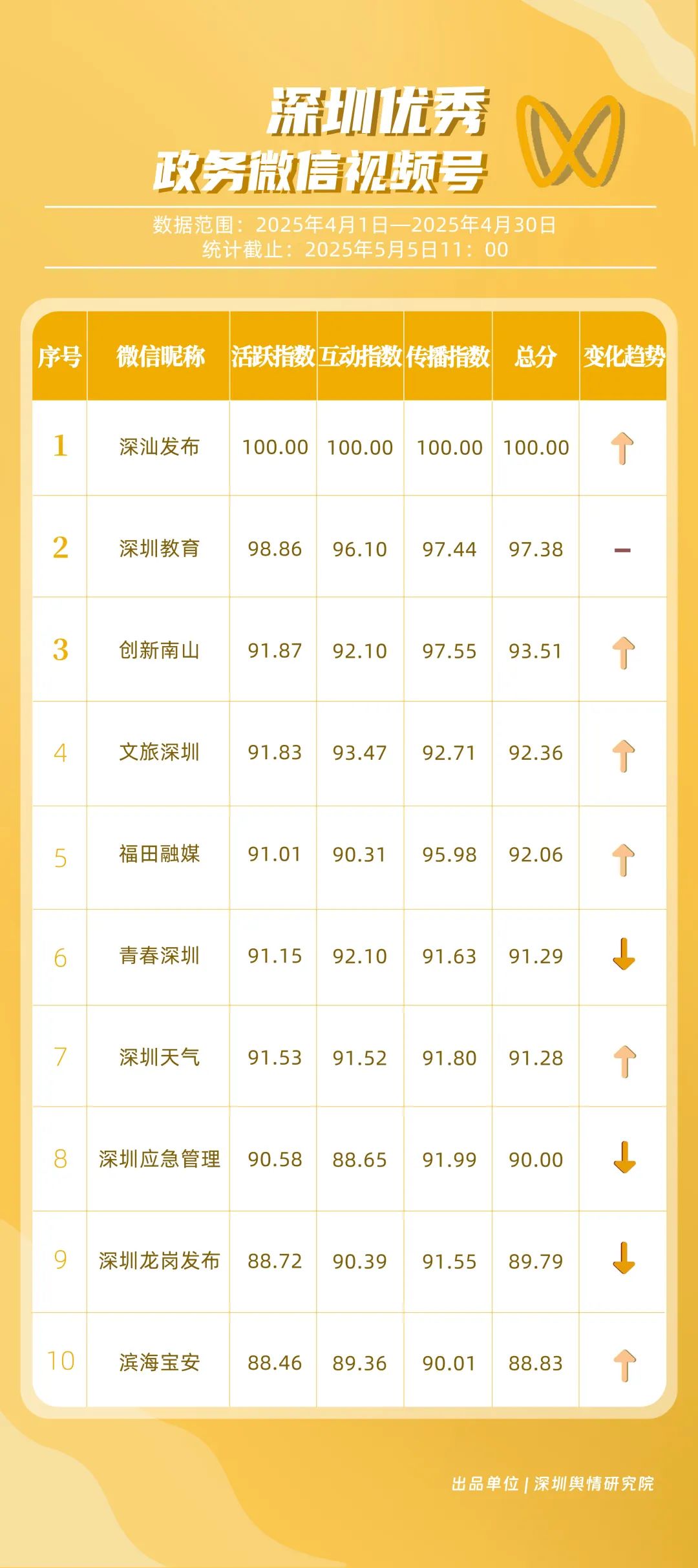 4月,包括“深圳衛(wèi)健委”“深圳龍崗發(fā)布”“幸福福田”“深圳光明”“i深圳”“創(chuàng)新南山”“青春深圳”“深圳交通”“深圳教育”“濱海寶安”等在內(nèi)的30個賬號入選“深圳優(yōu)秀政務(wù)微信公眾號”。其中,“深圳衛(wèi)健委”在活躍指數(shù)、互動指數(shù)、傳播指數(shù)上均拿到滿分,4月共有67篇推文閱讀量超10萬次,綜合得分穩(wěn)居榜單首位;“深圳龍崗發(fā)布”同樣表現(xiàn)亮眼,4月共產(chǎn)出13篇閱讀量超10萬次的爆款文章,綜合得分排名第二位;“幸福福田”則憑借持續(xù)輸出的高質(zhì)量內(nèi)容,排在榜單第三位?!吧钲诠饷鳌薄癷深圳”“創(chuàng)新南山”“青春深圳”也憑借扎實(shí)的內(nèi)容功底與良好的運(yùn)營策略,總分超85分。上榜賬號的亮眼成績,不僅彰顯了各自的傳播優(yōu)勢,更展現(xiàn)出各新媒體矩陣在微信公眾平臺的傳播勢能正持續(xù)攀升。