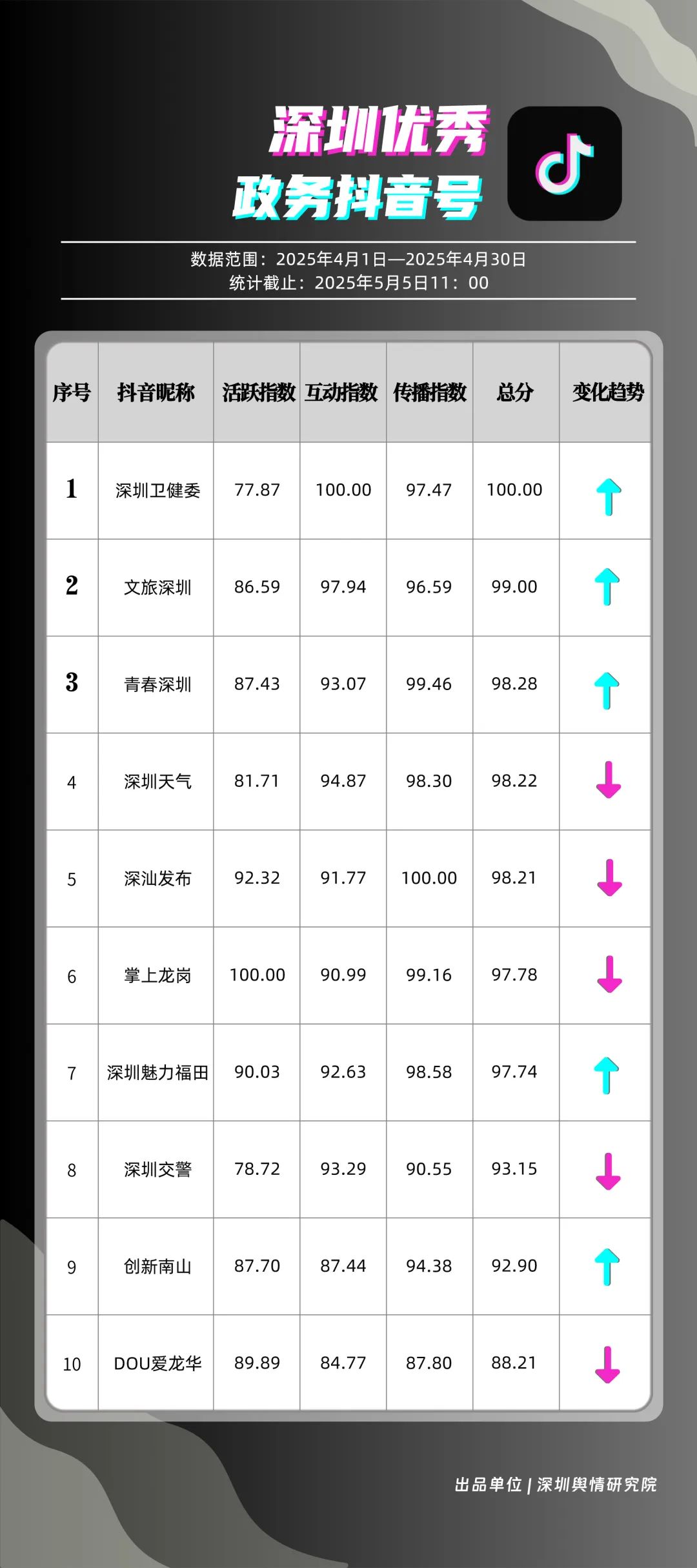 4月,“深圳衛(wèi)健委”“文旅深圳”“青春深圳”“深圳天氣”“深汕發(fā)布”“掌上龍崗”“深圳魅力福田”“深圳交警”“創(chuàng)新南山”“DOU愛龍華”共10個政務(wù)抖音號獲得“優(yōu)秀政務(wù)抖音號”稱號。4月,“深圳衛(wèi)健委”“文旅深圳”“青春深圳”憑借新穎的內(nèi)容策劃、生動的短視頻呈現(xiàn)方式,實(shí)現(xiàn)排名提升,位居榜單前三。“深圳天氣”“深汕發(fā)布”緊隨其后,以優(yōu)質(zhì)實(shí)用的內(nèi)容、接地氣的表達(dá),持續(xù)擴(kuò)大政務(wù)新媒體的傳播聲量。上榜賬號積極探索創(chuàng)新傳播路徑,以生動有趣的方式傳遞政務(wù)信息,為深圳政務(wù)新媒體在短視頻領(lǐng)域的發(fā)展注入新活力。