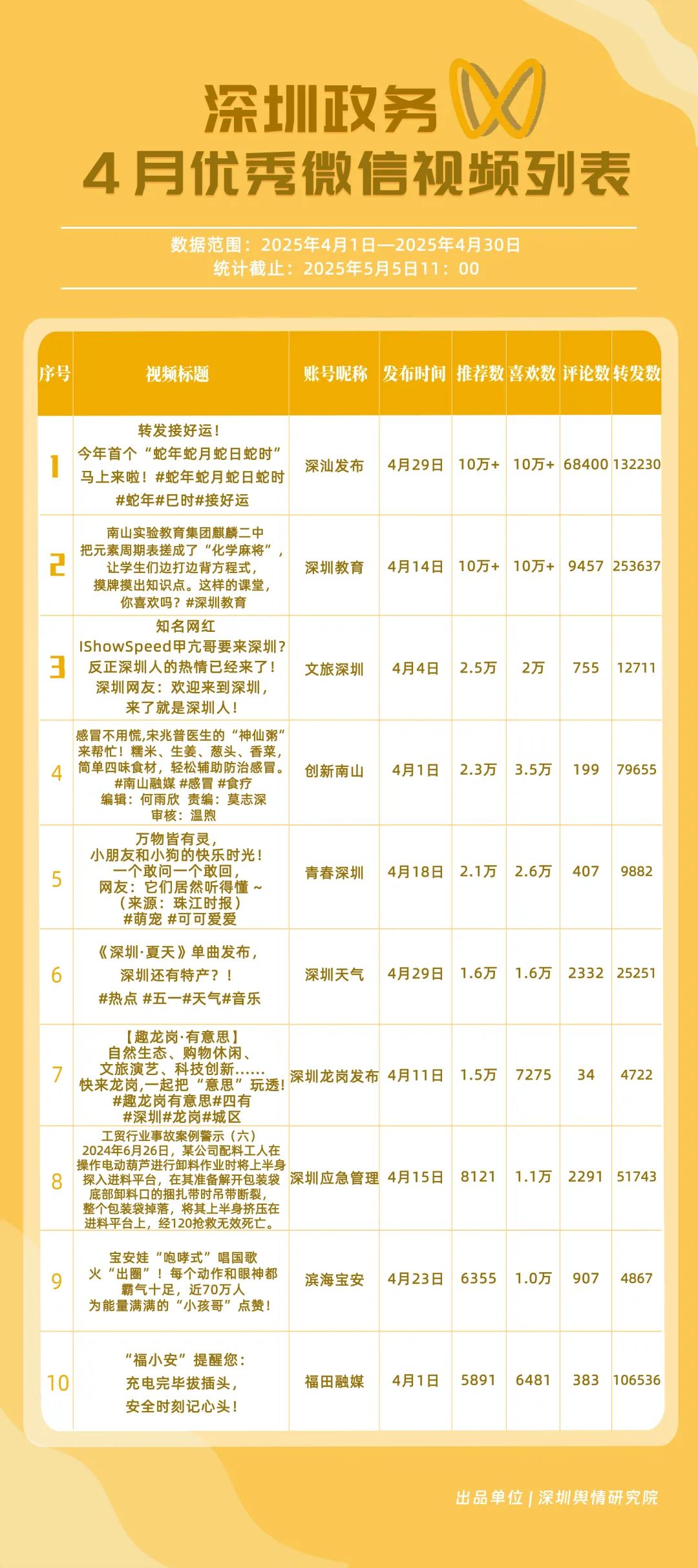 4月,獲“深圳優(yōu)秀政務(wù)微信視頻號”稱號的是“深汕發(fā)布”“深圳教育”“創(chuàng)新南山”“文旅深圳”“福田融媒”“青春深圳”“深圳天氣”“深圳應(yīng)急管理”“深圳龍崗發(fā)布”“濱海寶安”。其中,“深汕發(fā)布”憑借亮眼的數(shù)據(jù)表現(xiàn)成為榜首,其一條有關(guān)“蛇年蛇月蛇日蛇時”的視頻作品點(diǎn)贊量超10萬次、評論量超6.8萬次,轉(zhuǎn)發(fā)量超13萬次;“深圳教育”持續(xù)穩(wěn)定輸出優(yōu)質(zhì)內(nèi)容,以扎實(shí)的運(yùn)營實(shí)力鞏固自身影響力,位居榜單第2位;“創(chuàng)新南山”“文旅深圳”“福田融媒”分別位列榜單第3、4、5位,總分超92分,在區(qū)域形象宣傳、文旅資源推廣等方面展現(xiàn)出卓越的傳播效能,成為傳遞區(qū)域特色與發(fā)展動態(tài)的重要窗口。