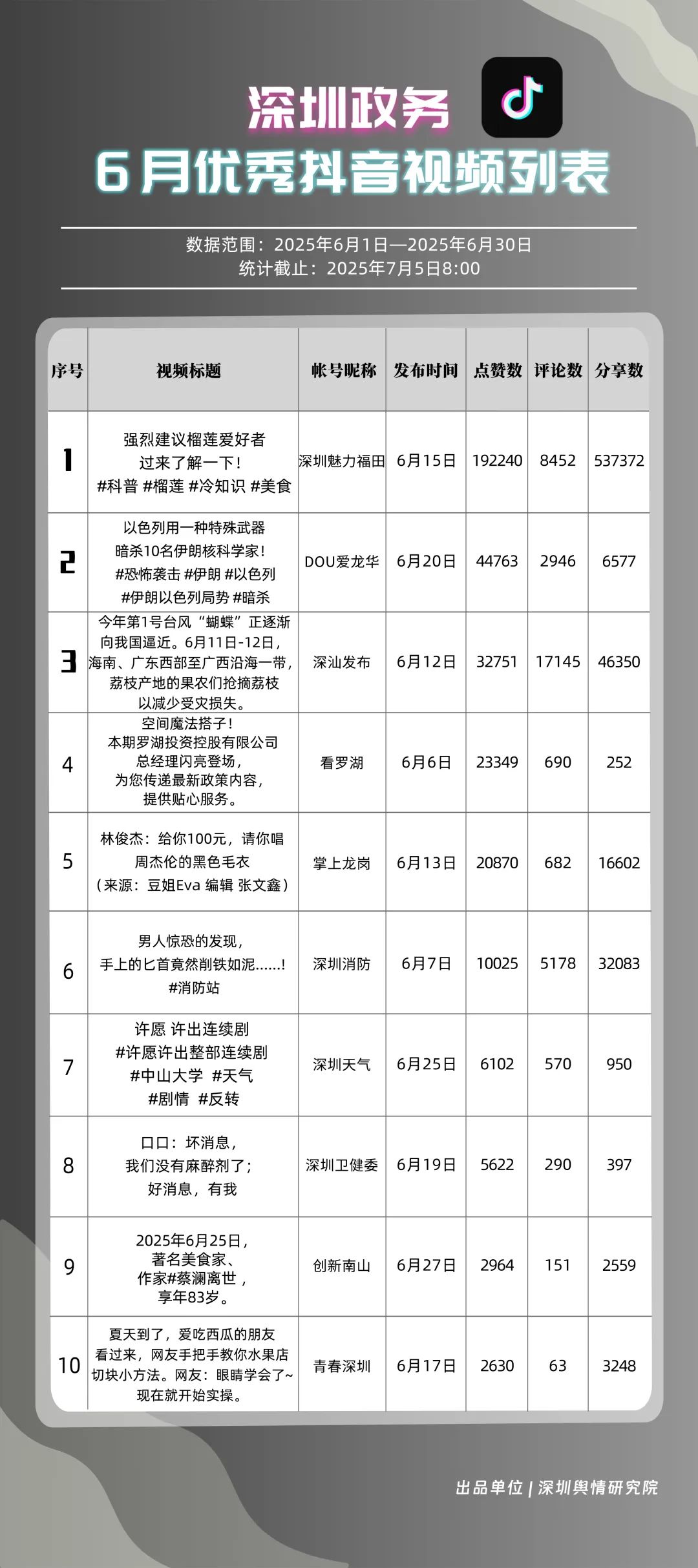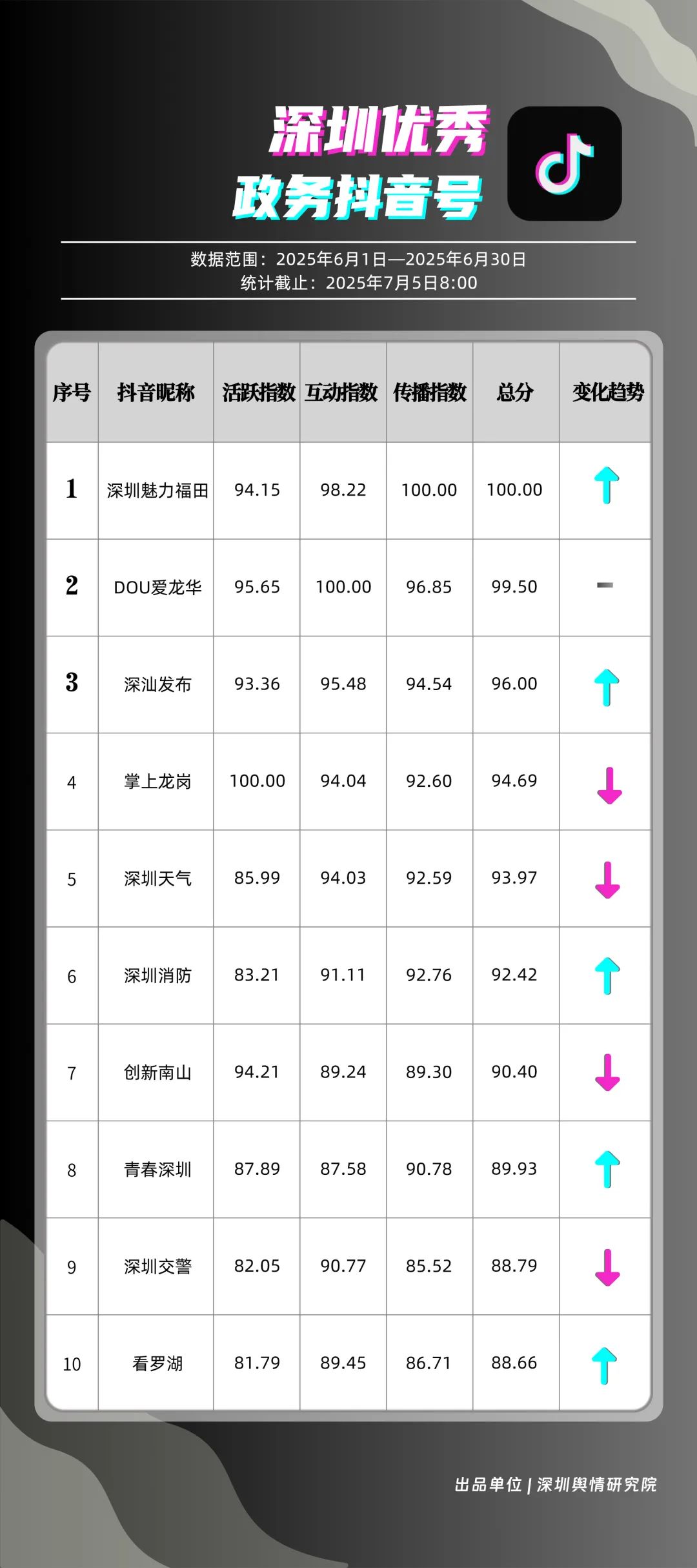 6月,“深圳魅力福田”“DOU愛龍華”“深汕發(fā)布”“掌上龍崗”“深圳天氣”“深圳消防”“創(chuàng)新南山”“青春深圳”“深圳交警”“看羅湖”共10個政務抖音號獲得“優(yōu)秀政務抖音號”稱號。6月,“深圳魅力福田”登頂,憑借其城市人文、社會熱點類主題短視頻,在傳播指數(shù)得分創(chuàng)新高;“DOU愛龍華”“深汕發(fā)布”“掌上龍崗”緊隨其后,通過各類熱點、創(chuàng)意內(nèi)容提升傳播效能。“深圳天氣”“深圳消防”也表現(xiàn)突出,短視頻內(nèi)容兼具“信息傳遞”與“情感共鳴”,用戶參與度持續(xù)提升,不斷為網(wǎng)民傳播有價值的政務信息資訊。