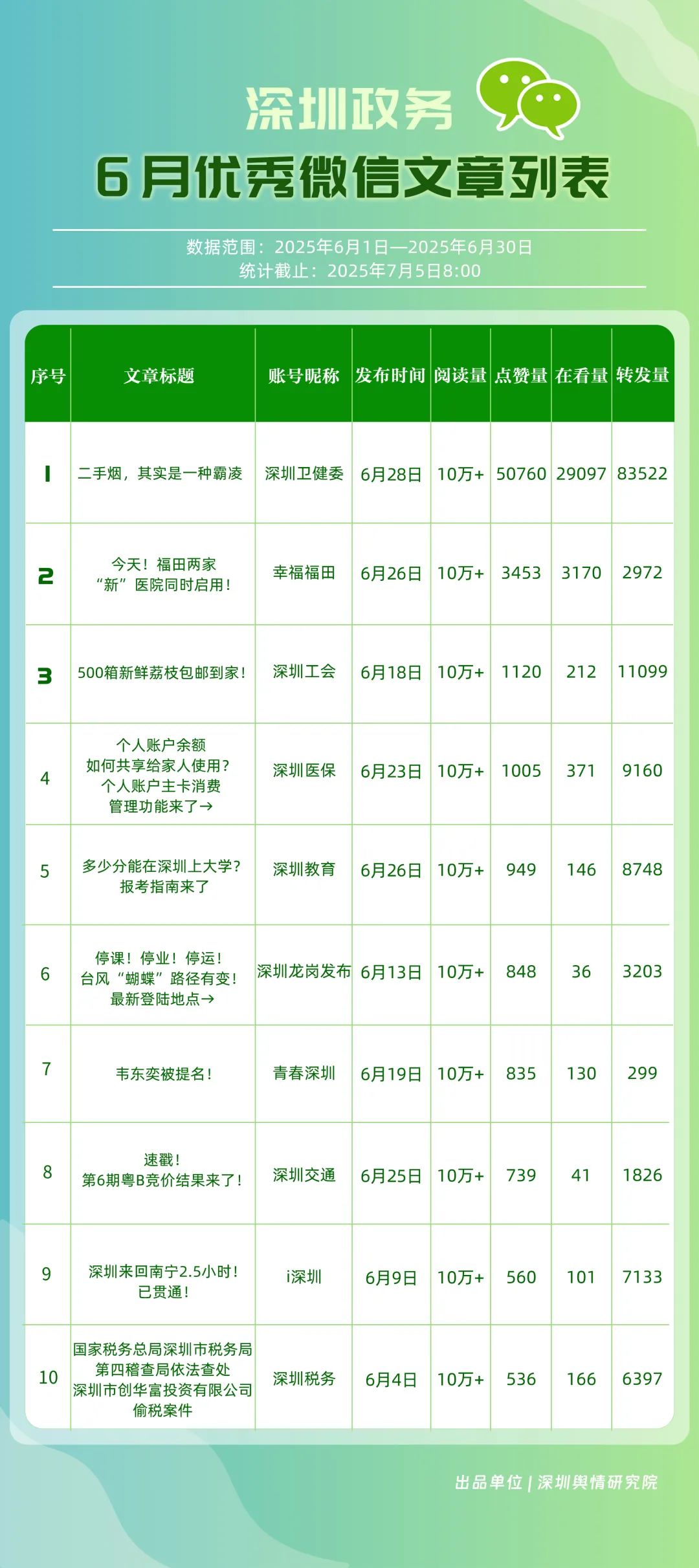 6月,30個政務微信公眾號入選“深圳優(yōu)秀政務微信公眾號”榜單,其中包括“深圳衛(wèi)健委”“幸福福田”“深圳龍崗發(fā)布”“i深圳”“創(chuàng)新南山”“青春深圳”“深圳光明”“深圳教育”“深圳龍華”“深圳工會”等。6月,榜單前三名的賬號保持穩(wěn)定,且各創(chuàng)作出多篇閱讀量超10萬次的優(yōu)質(zhì)文章,傳播指數(shù)得分均在100分以上?!吧钲谛l(wèi)健委”持續(xù)位居榜首,內(nèi)容專業(yè)性與傳播力持續(xù)領跑;“幸福福田”以92.94分位居第二,得分較5月有所提高。“深圳龍崗發(fā)布”“i深圳”“創(chuàng)新南山”也積極發(fā)布民生服務與宣傳活動內(nèi)容,排名靠前。上榜賬號整體呈現(xiàn)“內(nèi)容精品化、服務場景化”特點,持續(xù)優(yōu)化信息供給質(zhì)量,為用戶打造有深度的政務信息服務矩陣。