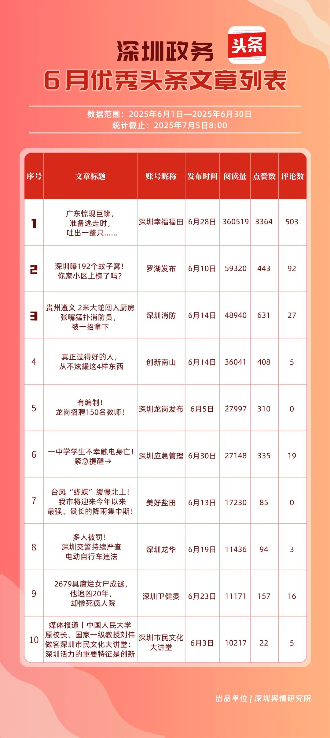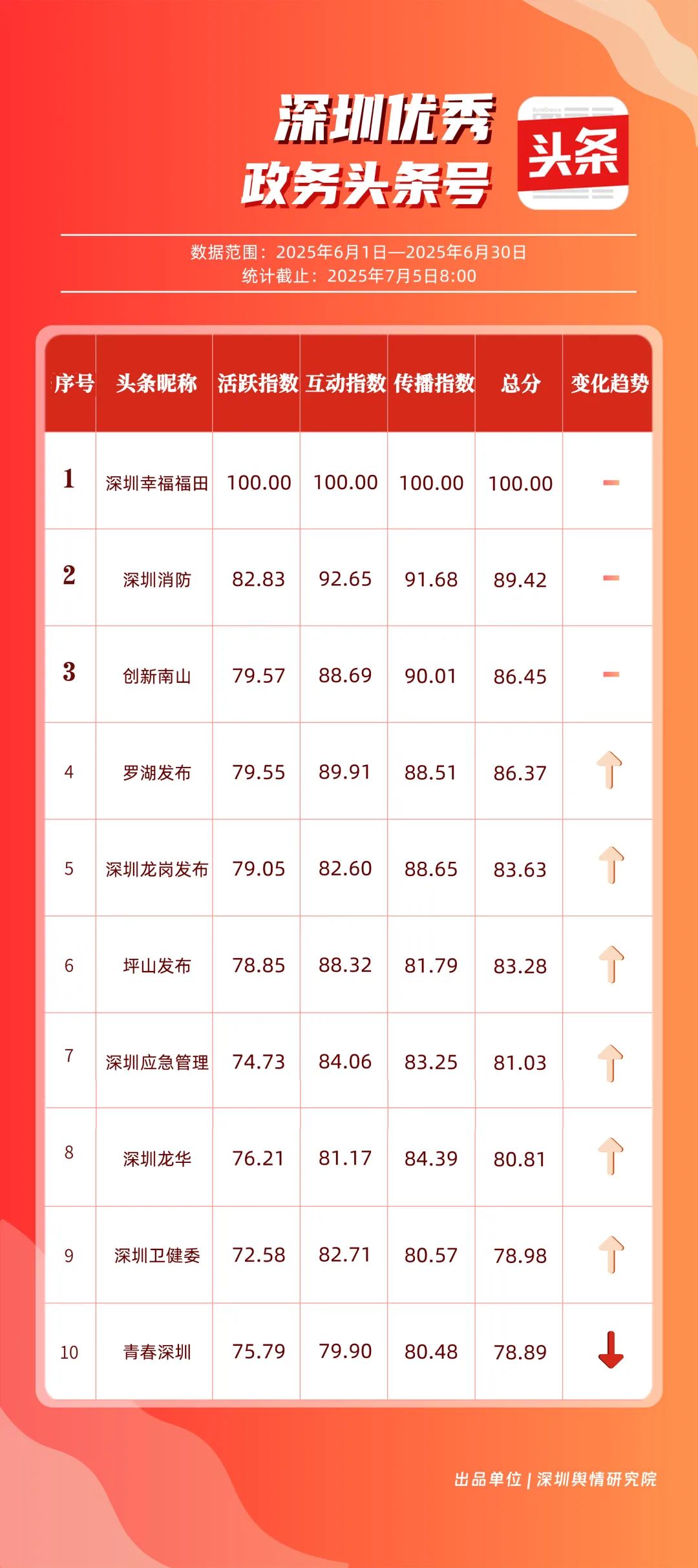 6月,“深圳幸福福田”“深圳消防”“創(chuàng)新南山”“羅湖發(fā)布”“深圳龍崗發(fā)布”“坪山發(fā)布”“深圳應急管理”“深圳龍華”“深圳衛(wèi)健委”“青春深圳”共10個政務頭條號入選“優(yōu)秀政務頭條號”榜單?!吧钲谛腋8L铩薄吧钲谙馈薄皠?chuàng)新南山”連續(xù)位居榜單前3名,內(nèi)容具備較強的吸引力?!傲_湖發(fā)布”“深圳龍崗發(fā)布”排名也在榜單前列,排名較5月有所上升,在區(qū)域形象宣傳與民生服務中持續(xù)發(fā)力。