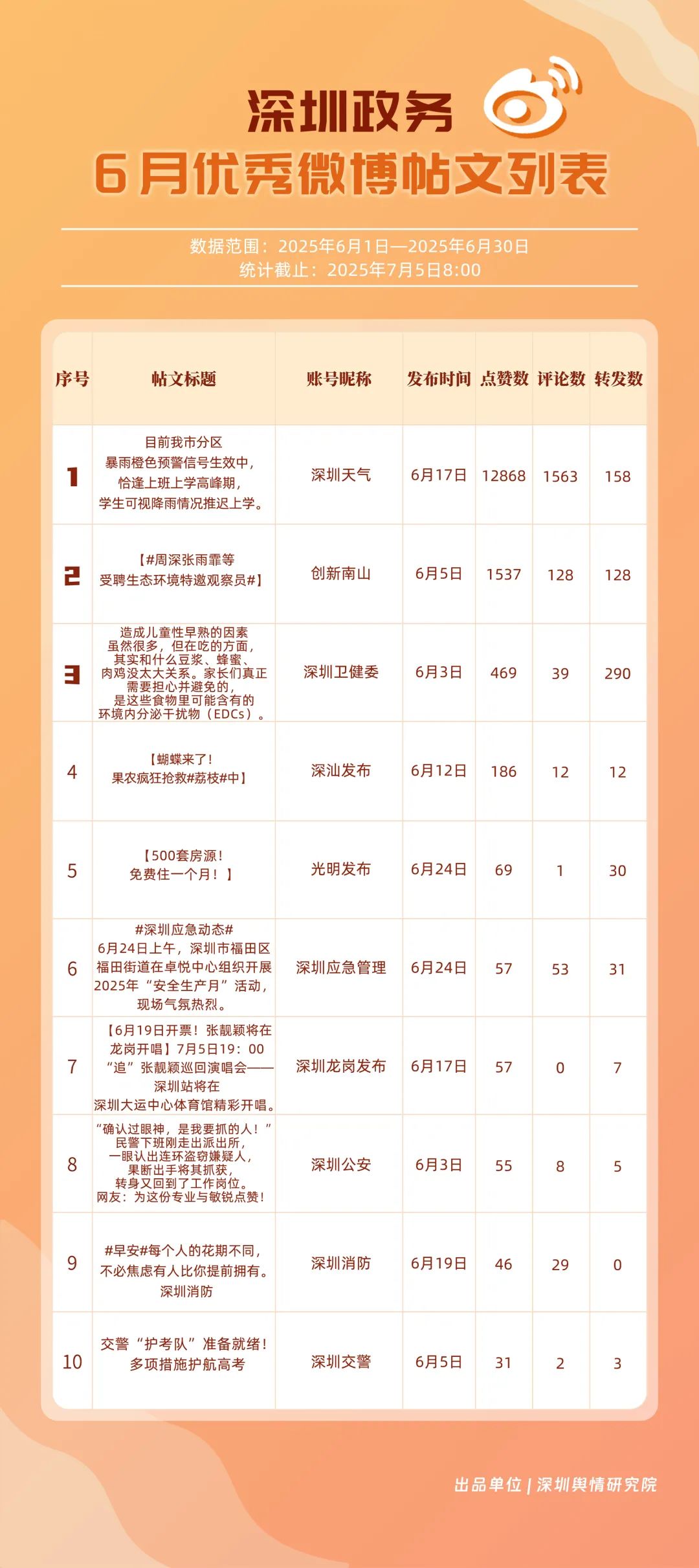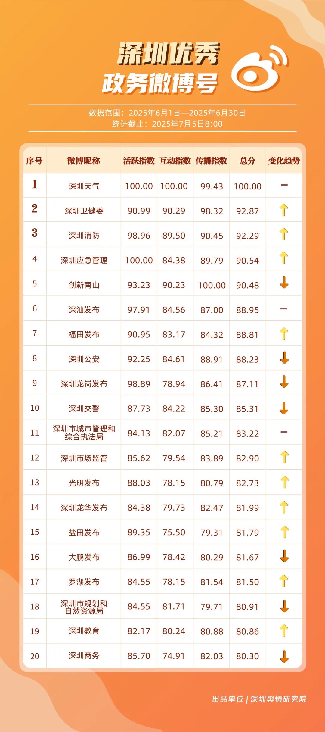 6月,“深圳天氣”“深圳衛(wèi)健委”“深圳消防”“深圳應急管理”“創(chuàng)新南山”“深汕發(fā)布”“福田發(fā)布”“深圳公安”“深圳龍崗發(fā)布”“深圳交警”等20個賬號入選“優(yōu)秀政務微博號”。其中,“深圳天氣”以活躍、互動指數(shù)雙滿分穩(wěn)居第一,氣象服務信息及時性與科普內(nèi)容趣味性獲市民高度認可;“深圳衛(wèi)健委”“深圳消防”“深圳應急管理”分別位列2至4位,通過熱點話題聯(lián)動醫(yī)療、消防、應急知識科普擴大影響力,政務微博矩陣在突發(fā)事件響應與民生服務中作用凸顯。