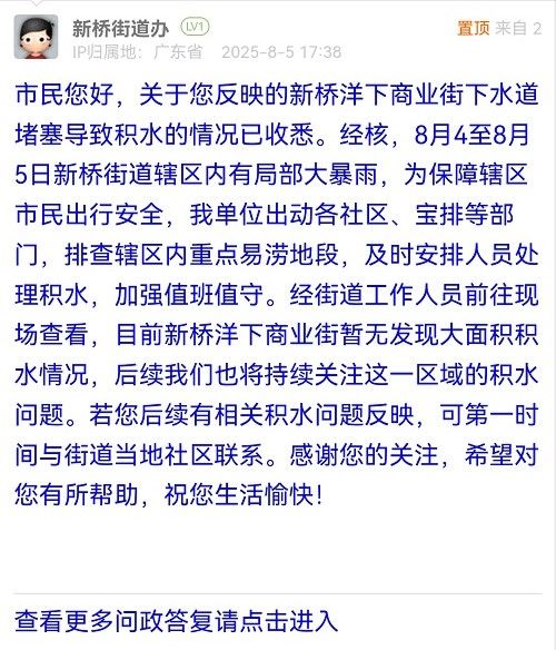 市民您好,關(guān)于您反映的新橋洋下商業(yè)街下水道堵塞導(dǎo)致積水的情況已收悉。經(jīng)核,8月4至8月5日新橋街道轄區(qū)內(nèi)有局部大暴雨,為保障轄區(qū)市民出行安全,我單位出動(dòng)各社區(qū)、寶排等部門,排查轄區(qū)內(nèi)重點(diǎn)易澇地段,及時(shí)安排人員處理積水,加強(qiáng)值班值守。經(jīng)街道工作人員前往現(xiàn)場查看,目前新橋洋下商業(yè)街暫無發(fā)現(xiàn)大面積積水情況,后續(xù)我們也將持續(xù)關(guān)注這一區(qū)域的積水問題。若您后續(xù)有相關(guān)積水問題反映,可第一時(shí)間與街道當(dāng)?shù)厣鐓^(qū)聯(lián)系。感謝您的關(guān)注,希望對您有所幫助,祝您生活愉快!