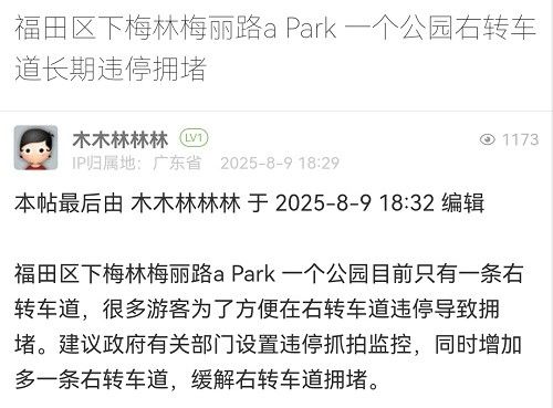 27. 帖文《福田區(qū)下梅林梅麗路a?Park?一個(gè)公園右轉(zhuǎn)車道長期違停擁堵》