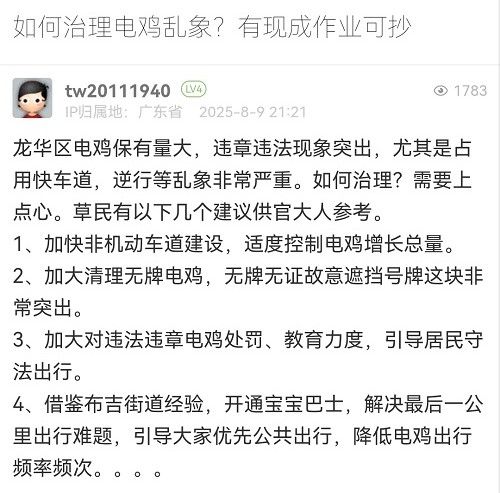 感謝您的反饋。龍華區(qū)作為深圳市的中軸新城,產(chǎn)業(yè)密集、人口居住集中,轄區(qū)電動(dòng)自行車保有量同樣呈快速增長狀態(tài),目前龍華區(qū)的非機(jī)動(dòng)車占全市總量約五分之一。一直以來,深圳市公安局交通管理局龍華大隊(duì)高度重視電動(dòng)自行車安全管理工作,從通行管理、秩序整治、隱患治理、宣傳教育四大方面綜合施策,不斷優(yōu)化治理策略,切實(shí)提升電動(dòng)自行車交通管理水平。您的建議我們也會向相關(guān)部門反饋,共同努力治理電動(dòng)車。再次感謝您對交通管理工作的支持和理解!