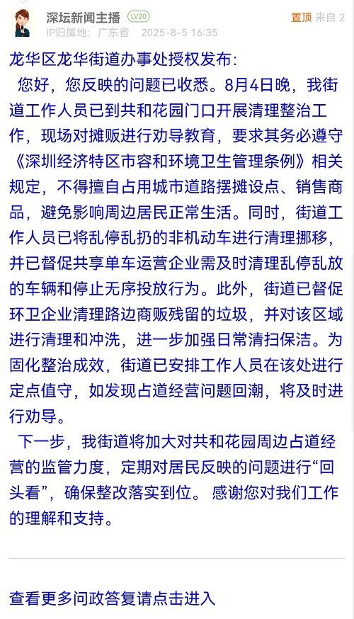 您好,您反映的問題已收悉。8月4日晚,我街道工作人員已到共和花園門口開展清理整治工作,現(xiàn)場對攤販進(jìn)行勸導(dǎo)教育,要求其務(wù)必遵守《深圳經(jīng)濟(jì)特區(qū)市容和環(huán)境衛(wèi)生管理?xiàng)l例》相關(guān)規(guī)定,不得擅自占用城市道路擺攤設(shè)點(diǎn)、銷售商品,避免影響周邊居民正常生活。同時(shí),街道工作人員已將亂停亂扔的非機(jī)動(dòng)車進(jìn)行清理挪移,并已督促共享單車運(yùn)營企業(yè)需及時(shí)清理亂停亂放的車輛和停止無序投放行為。此外,街道已督促環(huán)衛(wèi)企業(yè)清理路邊商販殘留的垃圾,并對該區(qū)域進(jìn)行清理和沖洗,進(jìn)一步加強(qiáng)日常清掃保潔。為固化整治成效,街道已安排工作人員在該處進(jìn)行定點(diǎn)值守,如發(fā)現(xiàn)占道經(jīng)營問題回潮,將及時(shí)進(jìn)行勸導(dǎo)。
