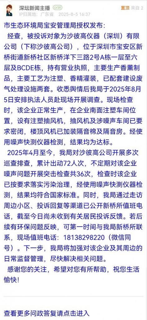 經(jīng)查,被投訴對象為沙彼高儀器(深圳)有限公司(下稱沙彼高公司),位于深圳市寶安區(qū)新橋街道新橋社區(qū)新橋洋下三路2號A棟一層至六層及BCDE棟,持有營業(yè)執(zhí)照,主要生產(chǎn)香薰制品,主要工藝為注塑、香精灌裝,已配套建設(shè)廢氣處理設(shè)施兩套。收悉輿情后我局于2025年8月5日安排執(zhí)法人員赴現(xiàn)場開展調(diào)查?,F(xiàn)場檢查時(shí),該企業(yè)正常生產(chǎn),在企業(yè)南面注塑車間位置,設(shè)有注塑抽風(fēng)機(jī),抽風(fēng)機(jī)及涉噪聲車間已要求密閉,樓頂風(fēng)機(jī)已加裝隔音棉及隔音房。經(jīng)使用噪聲快測儀器檢測,結(jié)果均為達(dá)標(biāo)。