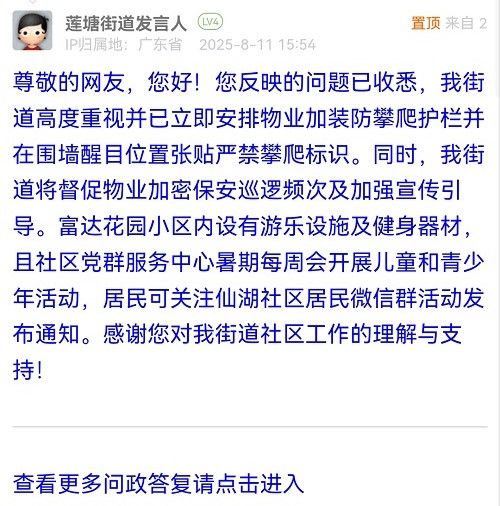 尊敬的網(wǎng)友,您好!您反映的問題已收悉,我街道高度重視并已立即安排物業(yè)加裝防攀爬護(hù)欄并在圍墻醒目位置張貼嚴(yán)禁攀爬標(biāo)識。同時(shí),我街道將督促物業(yè)加密保安巡邏頻次及加強(qiáng)宣傳引導(dǎo)。富達(dá)花園小區(qū)內(nèi)設(shè)有游樂設(shè)施及健身器材,且社區(qū)黨群服務(wù)中心暑期每周會開展兒童和青少年活動(dòng),居民可關(guān)注仙湖社區(qū)居民微信群活動(dòng)發(fā)布通知。感謝您對我街道社區(qū)工作的理解與支持!