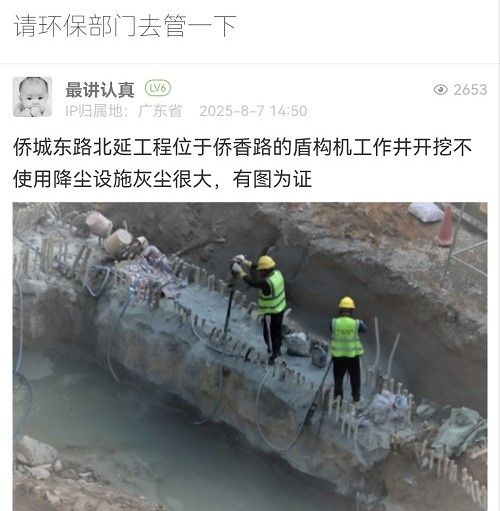 網(wǎng)友,您好!經(jīng)核實(shí),該處為僑城東路北延通道工程盾構(gòu)工作井施工現(xiàn)場,現(xiàn)場圍擋已安裝自動(dòng)噴淋系統(tǒng),并在主要施工區(qū)域設(shè)置霧炮機(jī)。目前現(xiàn)場正在開展鑿除地連墻混凝土施工,因作業(yè)點(diǎn)較分散,我們已安排施工單位增加霧炮機(jī),確保易揚(yáng)塵面濕法連續(xù)作業(yè)。后續(xù)將安排專人專責(zé),加強(qiáng)工地現(xiàn)場常態(tài)化巡視巡檢,做好防塵防護(hù)措施。感謝您的關(guān)注和理解!