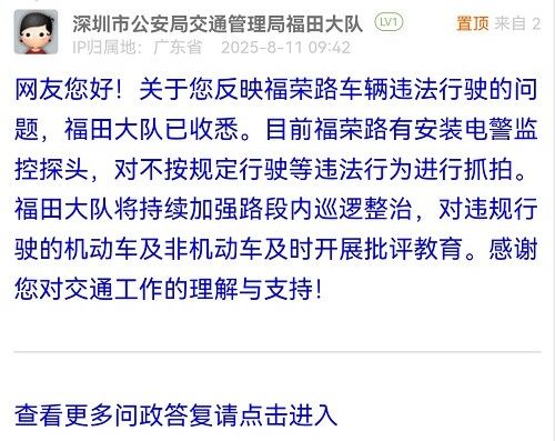 網(wǎng)友您好!關(guān)于您反映福榮路車輛違法行駛的問題,福田大隊(duì)已收悉。目前福榮路有安裝電警監(jiān)控探頭,對不按規(guī)定行駛等違法行為進(jìn)行抓拍。福田大隊(duì)將持續(xù)加強(qiáng)路段內(nèi)巡邏整治,對違規(guī)行駛的機(jī)動(dòng)車及非機(jī)動(dòng)車及時(shí)開展批評教育。感謝您對交通工作的理解與支持!