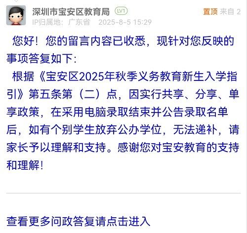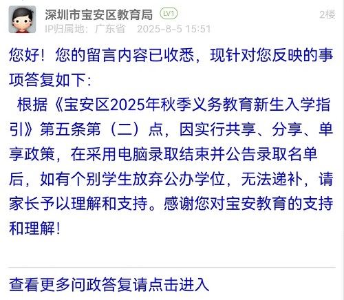 根據(jù)《寶安區(qū)2025年秋季義務(wù)教育新生入學(xué)指引》第五條第(二)點(diǎn),因?qū)嵭泄蚕?、分享、單享政策,在采用電腦錄取結(jié)束并公告錄取名單后,如有個(gè)別學(xué)生放棄公辦學(xué)位,無法遞補(bǔ),請家長予以理解和支持。感謝您對寶安教育的支持和理解!