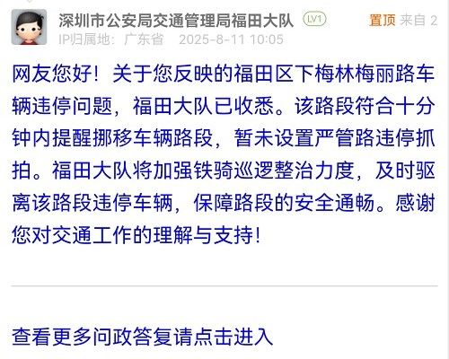 網(wǎng)友您好!關(guān)于您反映的福田區(qū)下梅林梅麗路車輛違停問題,福田大隊(duì)已收悉。該路段符合十分鐘內(nèi)提醒挪移車輛路段,暫未設(shè)置嚴(yán)管路違停抓拍。福田大隊(duì)將加強(qiáng)鐵騎巡邏整治力度,及時(shí)驅(qū)離該路段違停車輛,保障路段的安全通暢。感謝您對交通工作的理解與支持!