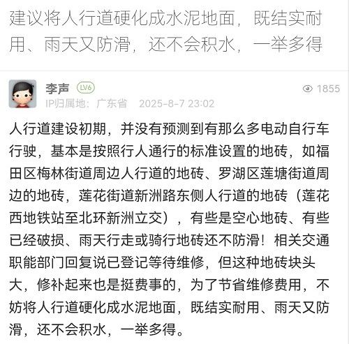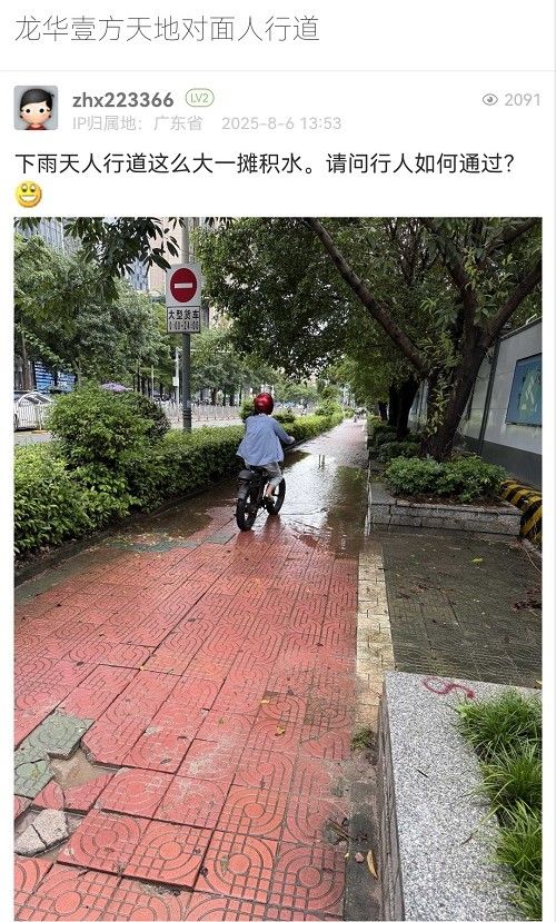 21. 帖文《建議將人行道硬化成水泥地面,既結(jié)實(shí)耐用、雨天又防滑,還不會積水,一舉多得》