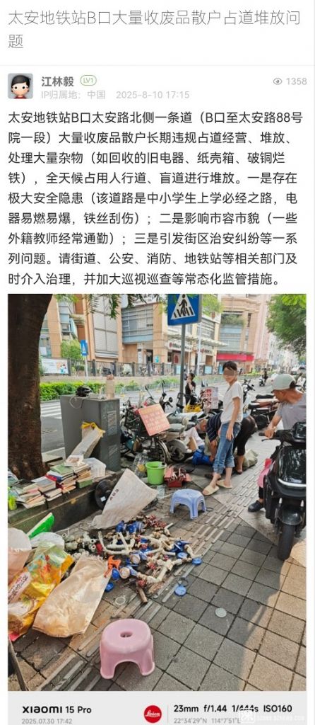 30. 帖文《太安地鐵站B口大量收廢品散戶占道堆放問題》