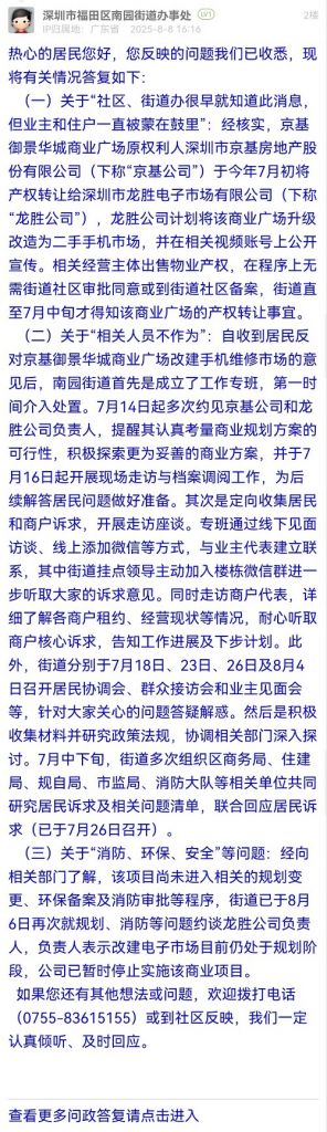 (二)關(guān)于“相關(guān)人員不作為”:自收到居民反對京基御景華城商業(yè)廣場改建手機(jī)維修市場的意見后,南園街道首先是成立了工作專班,第一時(shí)間介入處置。7月14日起多次約見京基公司和龍勝公司負(fù)責(zé)人,提醒其認(rèn)真考量商業(yè)規(guī)劃方案的可行性,積極探索更為妥善的商業(yè)方案,并于7月16日起開展現(xiàn)場走訪與檔案調(diào)閱工作,為后續(xù)解答居民問題做好準(zhǔn)備。其次是定向收集居民和商戶訴求,開展走訪座談。專班通過線下見面訪談、線上添加微信等方式,與業(yè)主代表建立聯(lián)系,其中街道掛點(diǎn)領(lǐng)導(dǎo)主動(dòng)加入樓棟微信群進(jìn)一步聽取大家的訴求意見。同時(shí)走訪商戶代表,詳細(xì)了解各商戶租約、經(jīng)營現(xiàn)狀等情況,耐心聽取商戶核心訴求,告知工作進(jìn)展及下步計(jì)劃。此外,街道分別于7月18日、23日、26日及8月4日召開居民協(xié)調(diào)會、群眾接訪會和業(yè)主見面會等,針對大家關(guān)心的問題答疑解惑。然后是積極收集材料并研究政策法規(guī),協(xié)調(diào)相關(guān)部門深入探討。7月中下旬,街道多次組織區(qū)商務(wù)局、住建局、規(guī)自局、市監(jiān)局、消防大隊(duì)等相關(guān)單位共同研究居民訴求及相關(guān)問題清單,聯(lián)合回應(yīng)居民訴求(已于7月26日召開)。