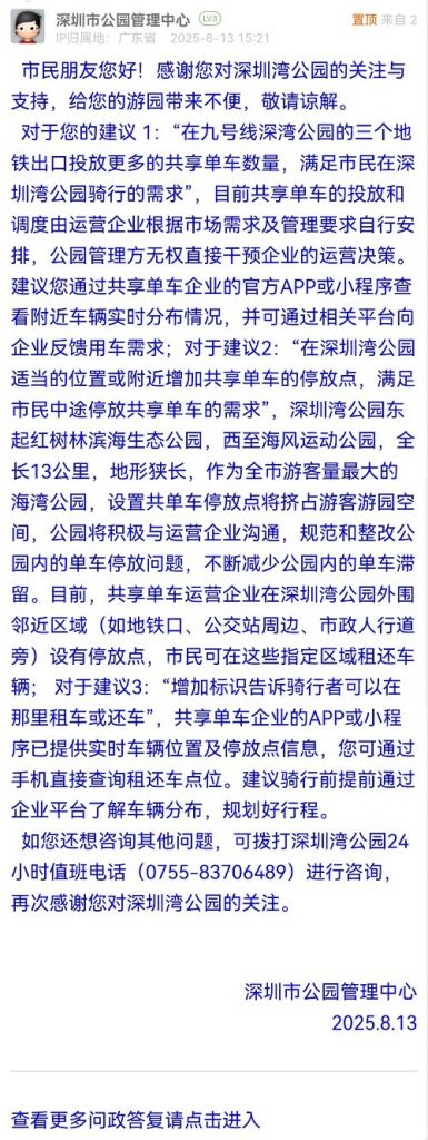 對于您的建議 1:“在九號線深灣公園的三個(gè)地鐵出口投放更多的共享單車數(shù)量,滿足市民在深圳灣公園騎行的需求”,目前共享單車的投放和調(diào)度由運(yùn)營企業(yè)根據(jù)市場需求及管理要求自行安排,公園管理方無權(quán)直接干預(yù)企業(yè)的運(yùn)營決策。建議您通過共享單車企業(yè)的官方APP或小程序查看附近車輛實(shí)時(shí)分布情況,并可通過相關(guān)平臺向企業(yè)反饋用車需求;對于建議2:“在深圳灣公園適當(dāng)?shù)奈恢没蚋浇黾庸蚕韱诬嚨耐7劈c(diǎn),滿足市民中途停放共享單車的需求”,深圳灣公園東起紅樹林濱海生態(tài)公園,西至海風(fēng)運(yùn)動(dòng)公園,全長13公里,地形狹長,作為全市游客量最大的海灣公園,設(shè)置共單車停放點(diǎn)將擠占游客游園空間,公園將積極與運(yùn)營企業(yè)溝通,規(guī)范和整改公園內(nèi)的單車停放問題,不斷減少公園內(nèi)的單車滯留。目前,共享單車運(yùn)營企業(yè)在深圳灣公園外圍鄰近區(qū)域(如地鐵口、公交站周邊、市政人行道旁)設(shè)有停放點(diǎn),市民可在這些指定區(qū)域租還車輛; 對于建議3:“增加標(biāo)識告訴騎行者可以在那里租車或還車”,共享單車企業(yè)的APP或小程序已提供實(shí)時(shí)車輛位置及停放點(diǎn)信息,您可通過手機(jī)直接查詢租還車點(diǎn)位。建議騎行前提前通過企業(yè)平臺了解車輛分布,規(guī)劃好行程。