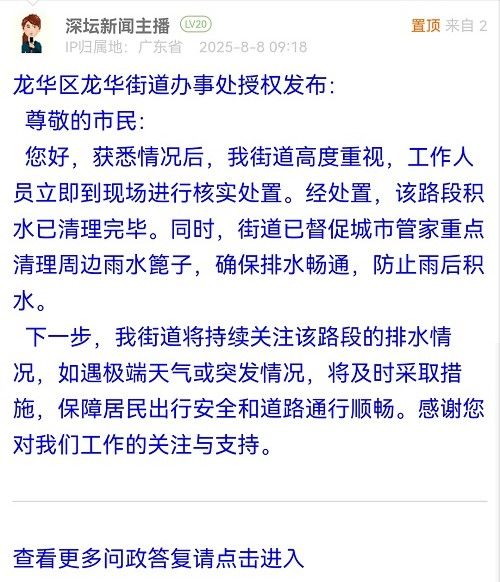 您好,獲悉情況后,我街道高度重視,工作人員立即到現(xiàn)場進(jìn)行核實(shí)處置。經(jīng)處置,該路段積水已清理完畢。同時(shí),街道已督促城市管家重點(diǎn)清理周邊雨水篦子,確保排水暢通,防止雨后積水。