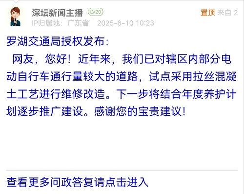網(wǎng)友,您好!近年來,我們已對轄區(qū)內(nèi)部分電動(dòng)自行車通行量較大的道路,試點(diǎn)采用拉絲混凝土工藝進(jìn)行維修改造。下一步將結(jié)合年度養(yǎng)護(hù)計(jì)劃逐步推廣建設(shè)。感謝您的寶貴建議!