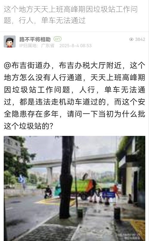 1. 帖文《這個(gè)地方天天上班高峰期因垃圾站工作問題,行人,單車無法通過》