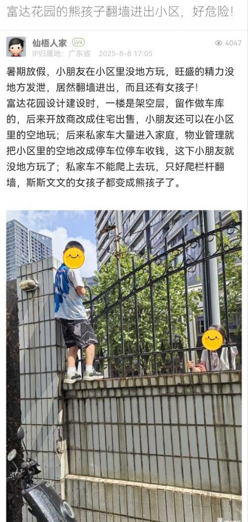 25. 帖文《富達(dá)花園的熊孩子翻墻進(jìn)出小區(qū),好危險(xiǎn)!》