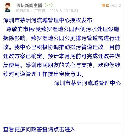 尊敬的市民:受燕羅濕地公園西側(cè)污水處理設(shè)施拆除影響,燕羅濕地公園公廁排污管道需進(jìn)行遷改。我中心已積極協(xié)調(diào)推動(dòng)排污管道遷改,目前遷改方案已確定,預(yù)計(jì)本月底前可完成遷改并恢復(fù)使用。感謝市民朋友的關(guān)心與支持,歡迎您繼續(xù)對河道管理工作提出寶貴意見。