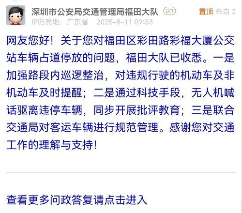 網(wǎng)友您好!關(guān)于您對福田區(qū)彩田路彩福大廈公交站車輛占道停放的問題,福田大隊(duì)已收悉。一是加強(qiáng)路段內(nèi)巡邏整治,對違規(guī)行駛的機(jī)動(dòng)車及非機(jī)動(dòng)車及時(shí)提醒;二是通過科技手段,無人機(jī)喊話驅(qū)離違停車輛,同步開展批評教育;三是聯(lián)合交通局對客運(yùn)車輛進(jìn)行規(guī)范管理。感謝您對交通工作的理解與支持!