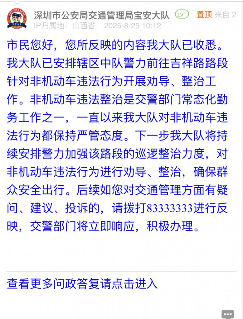 市民您好,您所反映的內(nèi)容我大隊(duì)已收悉。我大隊(duì)已安排轄區(qū)中隊(duì)警力前往吉祥路路段針對(duì)非機(jī)動(dòng)車違法行為開展勸導(dǎo)、整治工作。非機(jī)動(dòng)車違法整治是交警部門常態(tài)化勤務(wù)工作之一,一直以來(lái)我大隊(duì)對(duì)非機(jī)動(dòng)車違法行為都保持嚴(yán)管態(tài)度。下一步我大隊(duì)將持續(xù)安排警力加強(qiáng)該路段的巡邏整治力度,對(duì)非機(jī)動(dòng)車違法行為進(jìn)行勸導(dǎo)、整治,確保群眾安全出行。后續(xù)如您對(duì)交通管理方面有疑問(wèn)、建議、投訴的,請(qǐng)撥打83333333進(jìn)行反映,交警部門將立即響應(yīng),積極辦理。