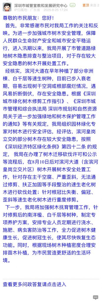 經(jīng)核實(shí),濱河大道在早年種植了部分非洲楝、白千層等速生樹種,目前已步入衰老期,容易出現(xiàn)樹干空洞或根部腐爛情況,遇風(fēng)易折斷倒伏,存在安全隱患。根據(jù)《深圳城市綠化樹木修剪工作指引》、《深圳市城市管理和綜合執(zhí)法局 深圳市規(guī)劃和自然資源局關(guān)于進(jìn)一步加強(qiáng)綠地和樹木保護(hù)管理工作的通知》等有關(guān)規(guī)定,我局組織園林綠化專家對(duì)樹木進(jìn)行安全評(píng)估,經(jīng)評(píng)估,濱河皇崗立交的部分樹木存在較大安全隱患,按照《深圳經(jīng)濟(jì)特區(qū)綠化條例》第四十二條 的規(guī)定, 我局在辦理了樹木遷移砍伐許可和公示等流程后,在8月10日后對(duì)濱河大道(含濱河皇崗立交片區(qū))樹木開展樹木安全處置工作,針對(duì)存在主干空腐、嚴(yán)重歪斜,無(wú)法通過(guò)修剪、扶正加固等手段整治的速生老化樹木進(jìn)行砍伐處置;針對(duì)根冠比失衡、偏冠、歪斜等速生老化樹木進(jìn)行重度修剪。