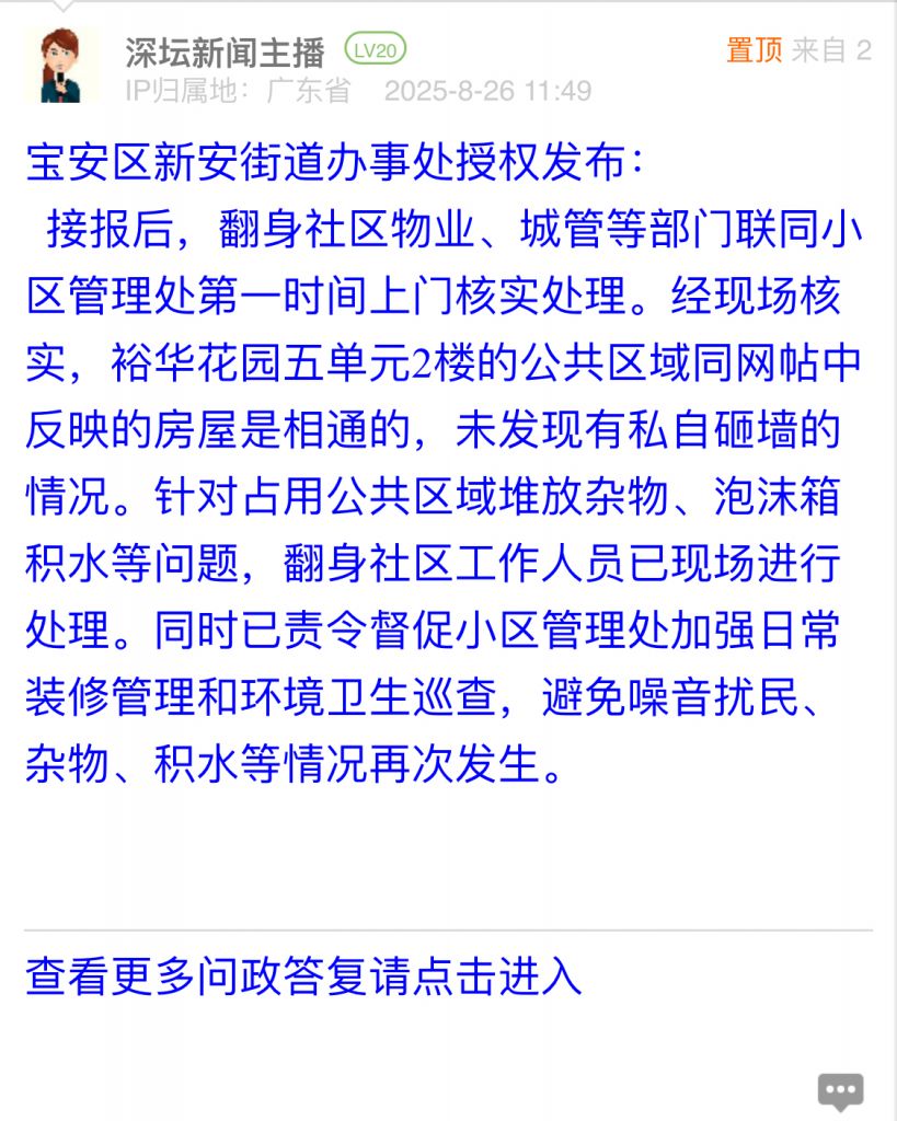 接報(bào)后,翻身社區(qū)物業(yè)、城管等部門聯(lián)同小區(qū)管理處第一時(shí)間上門核實(shí)處理。經(jīng)現(xiàn)場(chǎng)核實(shí),裕華花園五單元2樓的公共區(qū)域同網(wǎng)帖中反映的房屋是相通的,未發(fā)現(xiàn)有私自砸墻的情況。針對(duì)占用公共區(qū)域堆放雜物、泡沫箱積水等問(wèn)題,翻身社區(qū)工作人員已現(xiàn)場(chǎng)進(jìn)行處理。同時(shí)已責(zé)令督促小區(qū)管理處加強(qiáng)日常裝修管理和環(huán)境衛(wèi)生巡查,避免噪音擾民、雜物、積水等情況再次發(fā)生。
