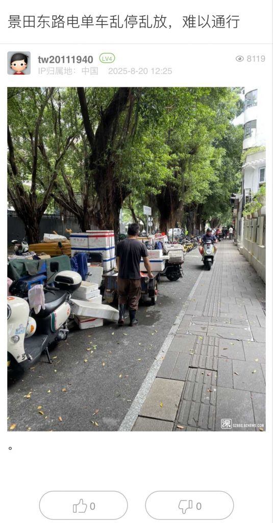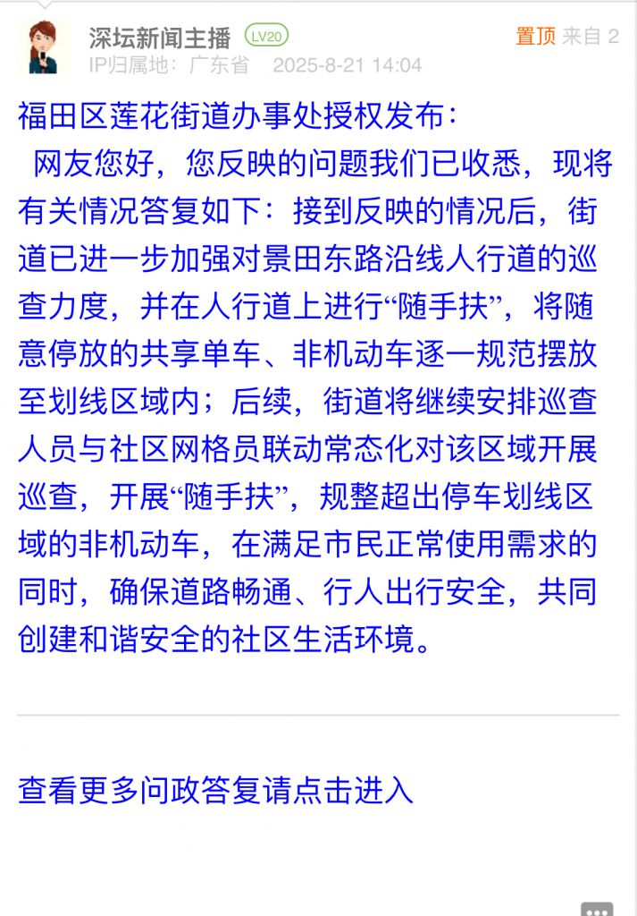 網(wǎng)友您好,您反映的問(wèn)題我們已收悉,現(xiàn)將有關(guān)情況答復(fù)如下:接到反映的情況后,街道已進(jìn)一步加強(qiáng)對(duì)景田東路沿線人行道的巡查力度,并在人行道上進(jìn)行“隨手扶”,將隨意停放的共享單車、非機(jī)動(dòng)車逐一規(guī)范擺放至劃線區(qū)域內(nèi);后續(xù),街道將繼續(xù)安排巡查人員與社區(qū)網(wǎng)格員聯(lián)動(dòng)常態(tài)化對(duì)該區(qū)域開展巡查,開展“隨手扶”,規(guī)整超出停車劃線區(qū)域的非機(jī)動(dòng)車,在滿足市民正常使用需求的同時(shí),確保道路暢通、行人出行安全,共同創(chuàng)建和諧安全的社區(qū)生活環(huán)境。