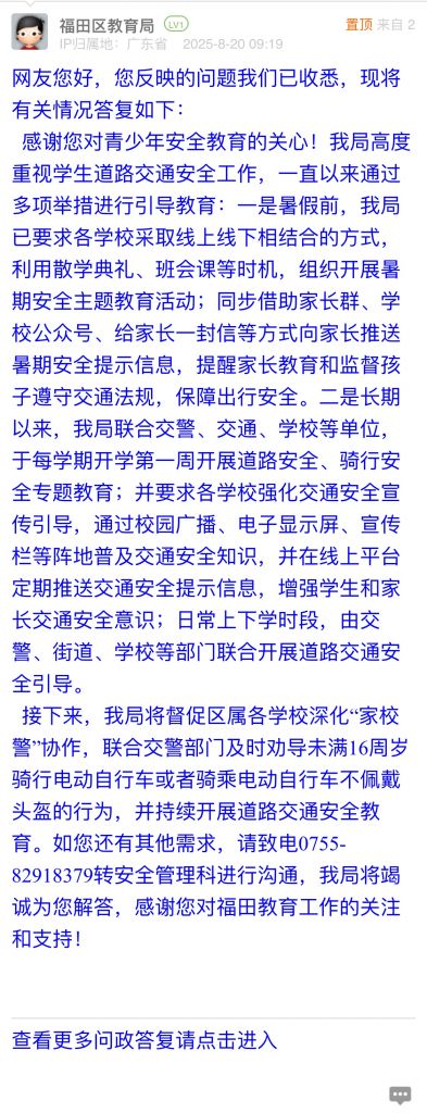 接下來(lái),我局將督促區(qū)屬各學(xué)校深化“家校警”協(xié)作,聯(lián)合交警部門及時(shí)勸導(dǎo)未滿16周歲騎行電動(dòng)自行車或者騎乘電動(dòng)自行車不佩戴頭盔的行為,并持續(xù)開展道路交通安全教育。如您還有其他需求,請(qǐng)致電0755-82918379轉(zhuǎn)安全管理科進(jìn)行溝通,我局將竭誠(chéng)為您解答,感謝您對(duì)福田教育工作的關(guān)注和支持!
